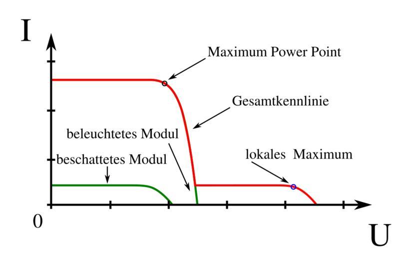 Keywords: MaximumPowerPointTeilbeschattung.svg de Kennlinie zur Teilbeschattung zweier in Reihe geschalteter Module own Stündle Inkscape Maximum power point tracker