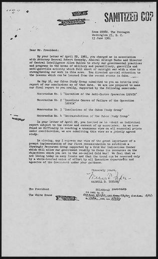| Keywords: Maxwell Taylor Memo to the President Paramilitary Study Report June 13, 1961 - NARA - 193273.tif Scope and content Memorandum to the President from Maxwell Taylor on his study of the Bay of Pigs General notes 193273 Local identifier President 1961-1963 Kennedy Office of the Special Assistant to the President for National Security Affairs 01/20/1961 - 11/22/1963 NARA-Place Cuba North and Central America nation 4186389 21 5 -80 <br /> John F Kennedy Library NLJFK Columbia Point Boston MA 02125-3398 1961-06-13 Record group Collection JFK-NSF Papers of President Kennedy National Security Files 01/20/1961 - 11/22/1963 Record group ARC 1164 Papers of President Kennedy National Security Files Countries compiled 01/20/1961 - 11/22/1963 Series ARC 193236 File unit Papers of President Kennedy National Security Files Countries Cuba Subjects Paramilitary Study Group Taylor Report 04/1961 - 07/1961 File unit ARC 193272 Variant control numbers NAIL Control Number NLK-NSF-CNTRYS-CUBASUBPSRTRMEM-4A yes Other versions NARA-cooperation PD-USGov Check categories-NARA 2011 September 13 Bay of Pigs Invasion |