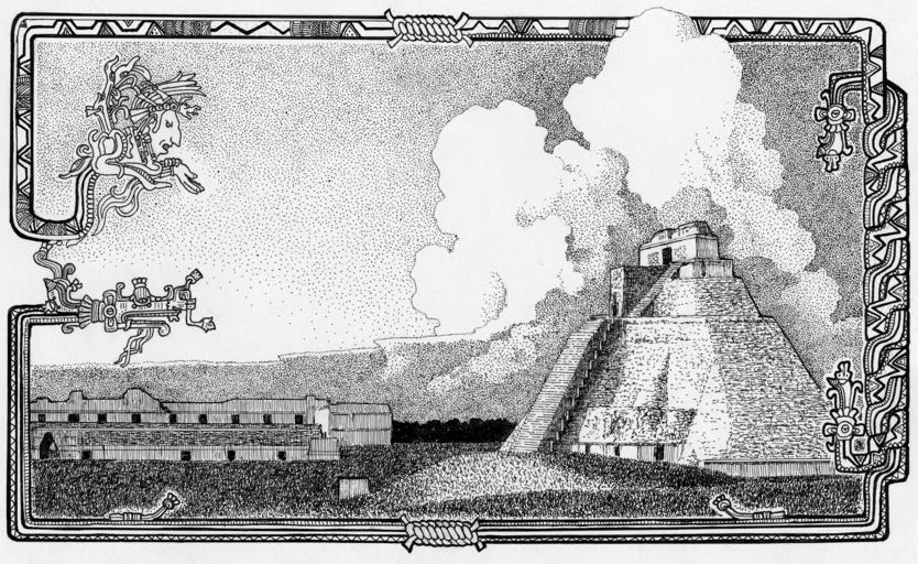 Keywords: maya temple pyramid ruin itza chichen-itza chichen religious indian worship black and white drawing