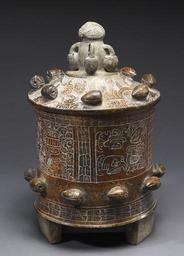 | Keywords: Mayan - Lidded Vessel - Walters 20092039 - View A.jpg The Classic Maya political landscape was divided into more than two dozen polities similar to city-states composed of a primary site plus aligned towns and villages Each was headed by a royal lineage supported by noble families and the polities often competed against each other for political and economic supremacy Feasts sponsored by the ruling elite provided a crucial platform for securing relations among aligned parties and negotiating new alliances Feasts were integral to elaborate affairs of state from rulers' accession rites to royal weddings to war victory celebrations and special religious observances The consumption of large amounts of sumptuous foods including drinks made from highly valued cacao chocolate was a focal point The banquets prompted the production of finely made food-service wares in the form of pictorial pottery their decorative imagery often featuring themes lauding the earthly or supernatural prowess of the host These ornate vessels also functioned as gifts their acceptance signaling the guests' alliance or at least an association with the host The vase's hieroglyphic text confirms its function as a drinking vessel-kakaw yuk'ib or the cacao drinking cup of The text goes on to name the cup's patron/owner at B2 and his father at d1-d2 Chakjal Mukuuy Reddening Dove Neither of these individuals is known from other Early Classic hieroglyphic texts and thus we do not know their political or familial identities Yet the artistic quality of the vessel and its detailed nominal phrase indicate their being members of the nobility if not a royal dynasty of the fourth-fifth centuries The two hieroglyphic texts are separated by pictorial panels featuring the maize god as an embodied cacao tree His bejeweled headdress is topped by a sprouting cacao tree like those adorning the vase's lid Modeled cacao pods embellish the vessel and the lid's knob is a cacao tree with a bird now broken The avian may be the false sun of the previous creation and avatar of the deity Itz'amnaj God D Uniting text and image panels are overlapping bands of cacao leaves The preponderance of cacao imagery supports the interpretation of the text's unusual introductory glyphs a1-b1 as sprouting cacao based on the first sign's resemblance to the vase's sprouting trees see the Maize god's headdress and its sub-fixed sign -la a well-known adjectival element in Maya hieroglyphic writing AD 250-550 Early Classic earthenware slip with incising cm 34 77 22 86 accession number 2009 20 39 80194 Stendahl Galleries Los Angeles date and mode of acquisition unknown John G Bourne 1970s by purchase Walters Art Museum Gift of John Bourne 2009 place of origin Guatemala Walters Art Museum license Maya art in the Walters Art Museum Maya tripod vessels Media contributed by the Walters Art Museum needs category review Theobroma cacao in art Maize god |