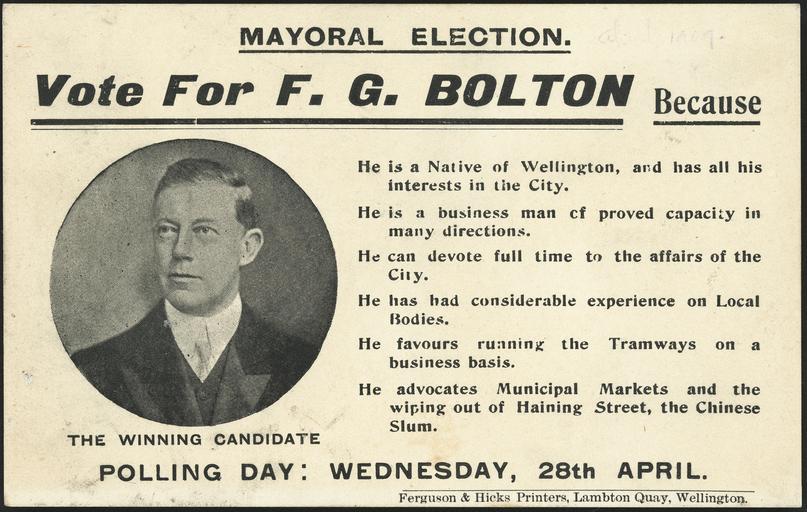 Keywords: people text An election card featuring an inset circular head and shoulders portrait of Frederick Bolton, a candidate for the Wellington mayoralty. Reasons for supporting him include: He is a native of Wellington, a business man of proven capacity; he can devote full time to the affairs of the city; he has had considerable experience on local bodies; he favours running the tramways on a business basis; he advocates municipal markets and the wiping out of Haining Street, the Chinese slum. Quantity: 1 b&w photo-mechanical print(s) on card. Physical Description: Photolithograph on card, 90 x 142 mm. Ferguson & Hicks (Firm). Mayoral election. Vote for F G Bolton, because ... Polling day, Wednesday, 28 April [1909]. Ferguson & Hicks Printers, Lambton Quay, Wellington.. Ref: Eph-A-LOCAL-Wellington-1909-01. Alexander Turnbull Library, Wellington, New Zealand. natlib.govt.nz/records/22873559 An election card featuring an inset circular head and shoulders portrait of Frederick Bolton, a candidate for the Wellington mayoralty. Reasons for supporting him include: He is a native of Wellington, a business man of proven capacity; he can devote full time to the affairs of the city; he has had considerable experience on local bodies; he favours running the tramways on a business basis; he advocates municipal markets and the wiping out of Haining Street, the Chinese slum. Quantity: 1 b&w photo-mechanical print(s) on card. Physical Description: Photolithograph on card, 90 x 142 mm. Ferguson & Hicks (Firm). Mayoral election. Vote for F G Bolton, because ... Polling day, Wednesday, 28 April [1909]. Ferguson & Hicks Printers, Lambton Quay, Wellington.. Ref: Eph-A-LOCAL-Wellington-1909-01. Alexander Turnbull Library, Wellington, New Zealand. natlib.govt.nz/records/22873559