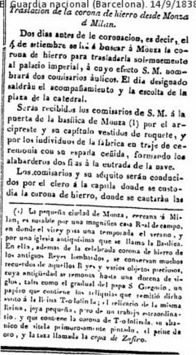 | Keywords: MB-Monza-1838-corona-ferrea-Ferdinando-I-Austria.jpg it Trasporto della corona ferrea da Monza a Milano il 4 9 1838 per l'incoronazione dell'imperatore d'Austria Fferdinando I come re del Lombardo-Veneto che avverrà nel Duomo di Milano il 6 9 1838 1838 El Guardia nacional Barcelona 14 9 1838 author thumb 100px right Traduzione in italiano dallo spagnolo Due giorni prima della incoronazione cioè il 4 di settembre andrà a prendere a Monza la corona ferrea per trasportarla solennemente al palazzo imperiale al cui scopo S M nominerà due commissari aulici Il giorno designato uscirà il seguito e la scorta della piazza della cattedrale I commissari di S M saranno ricevuti alla porta della basilica di Monza dall ™arciprete e dal suo capitano vestiti da cerimonia e dai dipendenti della fabbrica in abiti da cerimonia con la spada formando gli alabardieri due file all ™ingresso della navata principale I commissari e il loro seguito saranno condotti dal clero alla cappella dove si custodisce la corona ferrea dove si canteranno le ¦ La piccola città di Monza vicina a Milano è mirabile per una magnifica villa Reale dove il vice re trascorre una parte dell ™estate e per una chiesa antichissima che si chiama la Basilica In questa oltre alla celeberrima corona ferrea degli antichi re longobardi si conservano molti ricordi di quelli e vari oggetti preziosi la cui antichità risale a una dozzina di secoli così come il graduale del papa San Gregorio un papiro che contiene le reliquie che inviò il suddetto santo alla regina Teodolinda il reliquario della stessa regina opera piccola però di una lavorazione straordinaria e che contiene la corona di Teodolinda il suo ventaglio di vitello meticolosamente dipinto il pettine di oro e la tazza chiamata Coppa di Zaffiro PD-old Uploaded with UploadWizard History of Monza Monza in the 1830s Ferdinand I of Austria Iron Crown 1838 in Italy El Guardia Nacional ImageNote 1 14 32 201 undefined 238 430 2 Traduzione in italiano dallo spagnolo Due giorni prima della incoronazione cioè il 4 di settembre andrà a prendere a Monza la corona ferrea per trasportarla solennemente al palazzo imperiale al cui scopo S M nominerà due commissari aulici Il giorno designato uscirà il seguito e la scorta della piazza della cattedrale I commissari di S M saranno ricevuti alla porta della basilica di Monza dall ™arciprete e dal suo capitano vestiti da cerimonia e dai dipendenti della fabbrica in abiti da cerimonia con la spada formando gli alabardieri due file all ™ingresso della navata principale I commissari e il loro seguito saranno condotti dal clero alla cappella dove si custodisce la corona ferrea dove si canteranno le ¦ ImageNoteEnd 1 ImageNote 2 7 255 219 NaN 238 430 2 La piccola città di Monza vicina a Milano è mirabile per una magnifica villa Reale dove il vice re trascorre una parte dell ™estate e per una chiesa antichissima che si chiama la Basilica In questa oltre alla celeberrima corona ferrea degli antichi re longobardi si conservano molti ricordi di quelli e vari oggetti preziosi la cui antichità risale a una dozzina di secoli così come il graduale del papa San Gregorio un papiro che contiene le reliquie che inviò il suddetto santo alla regina Teodolinda il reliquario della stessa regina opera piccola però di una lavorazione straordinaria e che contiene la corona di Teodolinda il suo ventaglio di vitello meticolosamente dipinto il pettine di oro e la tazza chiamata Coppa di Zaffiro ImageNoteEnd 2 |
