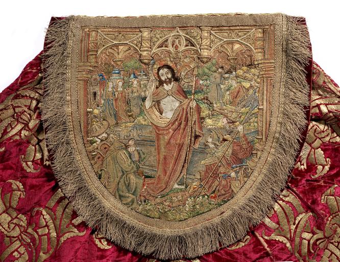 | Keywords: MCC-21485 Rode koorkap met verrijzenis op schild, aurifriezen met Bonifatius, Augustinus en Barbara (3).tif Artwork nl onbekend nl Koorkap van wijnrood zijdefluweel waarop met gouddraad grote gestyleerde bloemranken en bladeren geappliceerd zijn Op de rugzijde wordt op een koorkapschild onder drie halfronde baldakijnen met gewelven gescheiden door torentjes en in het midden een roosvenster de Verrijzenis van Christus afgebeeld Centraal op het schild staat Christus verrezen uit het graf gehuld in koormantel met agrafe In de linkerhand houdt hij een kruisvaan met de rechter maakt hij een zegenend gebaar Links van de geopende tombe naderen de drie Maria's Maria Magdalena Maria van Betthanië en een niet nader omschreven Maria Luc 7 36 om Christus' lichaam te balsemen Rechts 'Noli me tangere' 'Wil mij niet aanraken' Joh 20 11-19 waarin Maria Magdalena geknield opziet naar Christus die haar verschijnt als hovenier met een spade in de hand Aan weerskanten van het graf bewakers deels slapend; rechts schrikt een soldaat wakker Links op de achtergrond enkele gebouwen rechts een bergachtig Golgotha waarop de drie kruisen nog zichtbaar zijn De aurifriezen aan de voorkant van de mantel zijn van eerder datum ca 1490 Onder eenvoudige gotische baldakijnen worden tegen een gedamasceerde achtergrond in totaal acht heiligen en bisschoppen afgebeeld van wie er slechts drie middels een attribuut kunnen worden geïdentificeerd Op de linkerstrook wordt bovenaan Barbara uitgebeeld Het loshangend haar hangt over de schouders Ze houdt haar attribuut de toren in de rechterhand Onder Barbara in koormantel paus Cornelius met pausstaf in de linkerhand en tiara op het hoofd Zijn attribuut de hoorn houdt hij in de rechterhand Daaronder een bisschop of kerkvader met de staf in de rechterhand In de linker houdt hij een opengeslagen boek Onderaan weer een bisschop met een dicht boek in de rechterhand en een staf in de linkerhand Op de rechterkolom bovenaan een onbekende bisschop gevolgd door een bisschop die onder de koormantel een maliënkolder draagt Ansfridus Aan zijn voeten een wapenschildmet afwisselend rode en gouden stroken Daaronder de kerkvader Augustinus met zijn attribuut een hart in de linkerhand Rechts houdt hij de bisschopsstaf Onderaan een vierde bisschop of kerkvader die met beide handen een open boek vasthoudt Techniek het opmerkelijke van het weefsel is dat de motieven niet in de stof geweven zijn De gouddraden zijn eerst op een rode katoenen ondergrond gelegd en gehecht en later op het fluweel geappliceerd niet opgehoogd In het borduurwerk op het schild is voor de mantel van Christus en overige kleding de lazuurtechniek toegepast In de architectuur en achtergrond is gebruik gemaakt van deels opgehoogd gehecht en gelegd gouddraad De lichaamspartijen en het graslandschap zijn met zijde in de ingrijpsteek aangebracht De achtergrond van de figuren aan de voorkant van de koorkap is van gelegd en in blokjesmotief gehecht gouddraad Ook in de attributen en de architectuur is gebruik gemaakt van gouddraad De gezichten handen en mantels zijn van zijde in ingrijpsteek De tegelvloertjes zijn van gelegde en met gouddraad gehechte zijde Staat het zijdeborduuwerk aan de voorkant is hier en daar versleten; de gouden draden hangen deels los Staat een deel van de gelegde en met zijde gehechte gouddraden van de applicaties op het weefsel zijn losgeraakt Ook in het borduurwerk zitten enkele losse draden De zoom van de groen zijden voering is voor een groot deel versleten De franje onder aan de koorkap is uit later tijd 17de eeuw between 1490 1519 nl fluweel zijde gouddraad Size 148 322 cm Institution Museum Catharijneconvent place of discovery object history exhibition history credit line nl Foto Museum Catharijneconvent Utrecht foto Ruben de Heer accession number Object number 21485 Inventory number BMH t622 place of creation nl Zuid-Nederland https //www catharijneconvent nl/adlib/21485/ View this work on the website of Museum Catharijneconvent Museum Catharijneconvent Cc-zero Textiles in the Museum Catharijneconvent Media contributed by Museum Catharijneconvent Uploaded with pattypan |
