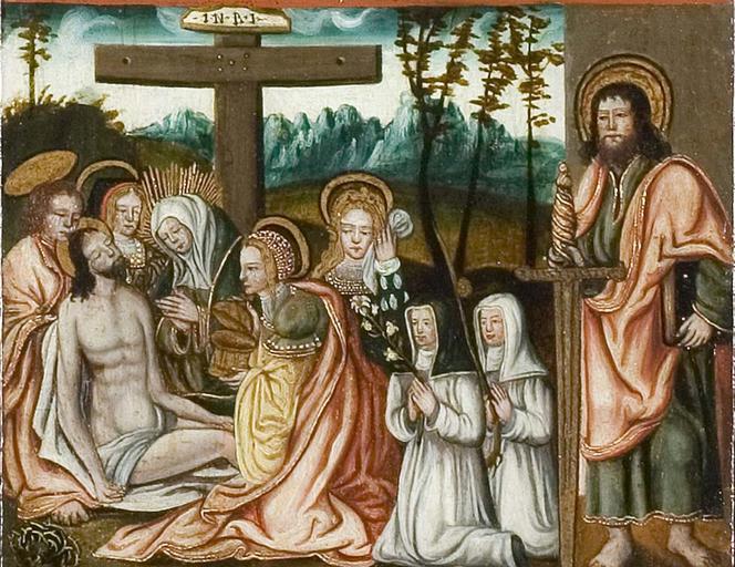 | Keywords: MCC-42054 Veelluik met het martelaarschap van de H. Theodosia (51).jpg Artwork nl Anonymous Gelre nl Middenstuk 1 Theodosia verzoekt toelating tot de gevangenis Rechtsboven een engel met banderol waarop de tekst Ghi sijt verhoert die geve die ghi do bidt heb ick gevestigt mit mijnen gelt die martelie te liden 2 Theodosia wordt bij de magistraat ter verantwoording geroepen Op het tekstbord Desen s alch sal ick mitter hulpen des heren voer s en 3 Theodosia ™s marteling aan de hefboom Op het tekstbord Ic ben bereyd dinc voer iezus christo te liden 4a Theodosia aan de schandpaal 4b Theodosia ™s ledematen worden uitgerekt 5 Allegorische voorstelling Christus aan het kruis met het offerlam op zijn schouders; onder het kruis negen schapen Op de voorgrond links een non rechts koning David met een gouden kroon op zijn hoofd en een herdersstaf met schep in beide handen die hij naar de non uitsteekt; tussen hen in ligt een harp Op het tekstbord suster hoede die scapen dier gedacten in die minne des brudegoms iesus opten berch caluarie 6a Theodosia uit het water gered door twee engelen 6b Vijf nonnen en een vrouw in wereldse kledij bezoeken Theodosia in de gevangenis Op het tekstbord min medes elen in cro Christo den enge w ech Het opschrift op de lijst onder de voorstelling is onleesbaar 7 Theodosia voor de wilde dieren geworpen Op het tekstbord nu suldi bekennen hoe vol si vermogen die god mit pueren herten minnen 8 Onthoofding van Theodosia Op het tekstbord dat ic inren tiit des vreden heb vercregen dat sal ic inden striit nie verliesen 9a Verschijning van Theodosia aan haar ouders Op het tekstbord sieh hoe soet die glorie ist daer du mi af beroeven wolste 9b Begrafenis van Theodosia Een zwevende engel met banderol waarop si heft nu salighe vrocht Aan weerszijden van deze taferelen zijn vrouwelijke heiligen afgebeeld steeds twee aan twee met tussen hen in een geknielde non Op de eerste voorstelling links in plaats van een vrouwelijke heilige Maria met kind Links 10a Madonna op de maansikkel en Fides Opschriften / fides 10b Caritas en Spes Opschriften niet leesbaar 11a Agatha en Dorothea Opschriften aghata / doratea 11b Apollonia met attribuut van Agatha tang waarin in plaats van een tand een borst is geklemd en Euphrosia Opschriften appolonia / effrosia 12a Anatolia en Christina Opschriften anatolia / 12b Victoria en Sophia Opschriften victoria / sophia Rechts 13a Margaretha en Gertrudis Opschriften a gretha / gertrudis 13b Ursula en Walburga Opschriften ursula / 14a Catharina en Barbara Opschriften katrina / barbara 14b Agnes en Prisca Opschriften agneta / priska 15a Cecilia en Cunera Opschriften cecilia / cunera 15b Lucia en Clara Opschriften lucia / clara Binnenzijde linkerluiken 16 Kruisdraging met Veronica en Simon van Cyrene 17 Doornenkroning Rechts een als priester geklede heilige met een kelk in de hand en een knielende non 18 Geseling Rechts een H Bisschop 19 Christus in de Hof van Olijven en de stigmatisatie van de Franciscus 20 Besnijdenis Rechts een reguliere kanunnik en een geknielde vrouw in 16de-eeuwse kledij met de attributen van de H Goedele een lantaarn geflankeerd door een engel met een brandende kaars en een duivel met een blaasbalg; daaronder het opschrift gudila 21 Ontkleding van Christus Rechts een heilige met een boek en een ladder 22 Kruisnageling Rechts de apostel Thomas 23 Christus aan het kruis met Maria Johannes en de drie vrouwen Rechts Antonius 24 Bewening Rechts de apostel Paulus en twee geknielde nonnen 25 Christus treedt de wijnpers Links Augustinus rechts een reguliere kanunnik Binnenzijde rechterluiken 26 Aanbidding der koningen 27 Geboorte van Christus Opschrift gloria in excelsis 28a Visitatie 28b Vier nonnen knielend voor een altaar waarop een drieluik met de Kruisiging Achter hen een priester Boven diens hoofd h ia Rechts daarvan een banderol met eenregelige tekst van een lied adv i g i I Fi Filius dn domini 29 Annunciatie Opschrift ave gratia plena 30 Genadestoel Rechtsonder op de voorgrond knielt een non Op het tekstbord god die alle creatueren gescapen heft en ons mit sin dierbaren bloet verlost heft hi wil ock sin gracie geuen ge eit v an der oude naam van de stichtster-non 31 Christus verschijnt aan Maria 32 Hemelvaart van Christus 33 Kroning van Maria 34 Allegorische voorstelling God de Vader gezeten op een troon met op de trappen die naar de troon voeren links de vijf wijze rechts de vijf dwaze maagden; in het midden een engel boven de hellemond met drie verdoemden Op de banderol in de linkerhand van de engel Gae t of Myt ghi vermadi vermaledijden ; op de banderol in zijn rechterhand coemt ghi gebenedide Op het tekstbord bij de wijze maagden gaet tot der gene daer se te coop is Op het tekstbord bij de dwaze maagden geft ons den olie vor ons lamp Op de banderol aan de onderzijde van de voorstelling rick der hemelen sal worden all fiere maechden Buitenzijde linkerluiken Nr 35 36 en 40 t/m 44 zijn gewijd aan de zeven vallen van Christus De voorstellingen zijn zeer verwant aan zeven houtsneden met dit thema gedrukt op één blad getiteld ˜O mensch betracht dy siben vell Christi und dy siben herzenlaydt Marie ™ Wenen Albertina inv nr 1930-70 Zuid-Duitsland ca 1480; zie Marrow 1979 p 82 89 100 106 131 170 pl VIII 35 Christus ™ val voor de kruisnageling zesde val 36 Kruisoprichting zevende val 37 Allegorische voorstelling Christus als Man van Smarten en gebonden aan de geselpaal houdt een rood koord vast dat verbonden is met een knielende non Tekstrol Christus o dochter vollighet my want ic gepassijt bin voor di wilt mij u hert geven om ewich te leuen Tekstrol non here ic offer u myn hert nu ende inder ewicheit Achter de non zeven kleinere opschriften verwijzend naar zeven deugden elk voorafgegaan door een hand met een geselroede waarvan de eerste en de derde onleesbaar zijn 2 die mel it mildheid ; 4 gehoorsamheijt; 5 wakinge; 6 silencia ; 7 arheyt waarheid 38 Allegorische voorstelling In een ommuurde tuin slaat Christus met een hamer o
