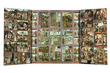 | Keywords: MCC-42054 Veelluik met het martelaarschap van de H. Theodosia (1).jpg Artwork nl Anonymous Gelre nl Middenstuk 1 Theodosia verzoekt toelating tot de gevangenis Rechtsboven een engel met banderol waarop de tekst Ghi sijt verhoert die geve die ghi do bidt heb ick gevestigt mit mijnen gelt die martelie te liden 2 Theodosia wordt bij de magistraat ter verantwoording geroepen Op het tekstbord Desen s alch sal ick mitter hulpen des heren voer s en 3 Theodosia ™s marteling aan de hefboom Op het tekstbord Ic ben bereyd dinc voer iezus christo te liden 4a Theodosia aan de schandpaal 4b Theodosia ™s ledematen worden uitgerekt 5 Allegorische voorstelling Christus aan het kruis met het offerlam op zijn schouders; onder het kruis negen schapen Op de voorgrond links een non rechts koning David met een gouden kroon op zijn hoofd en een herdersstaf met schep in beide handen die hij naar de non uitsteekt; tussen hen in ligt een harp Op het tekstbord suster hoede die scapen dier gedacten in die minne des brudegoms iesus opten berch caluarie 6a Theodosia uit het water gered door twee engelen 6b Vijf nonnen en een vrouw in wereldse kledij bezoeken Theodosia in de gevangenis Op het tekstbord min medes elen in cro Christo den enge w ech Het opschrift op de lijst onder de voorstelling is onleesbaar 7 Theodosia voor de wilde dieren geworpen Op het tekstbord nu suldi bekennen hoe vol si vermogen die god mit pueren herten minnen 8 Onthoofding van Theodosia Op het tekstbord dat ic inren tiit des vreden heb vercregen dat sal ic inden striit nie verliesen 9a Verschijning van Theodosia aan haar ouders Op het tekstbord sieh hoe soet die glorie ist daer du mi af beroeven wolste 9b Begrafenis van Theodosia Een zwevende engel met banderol waarop si heft nu salighe vrocht Aan weerszijden van deze taferelen zijn vrouwelijke heiligen afgebeeld steeds twee aan twee met tussen hen in een geknielde non Op de eerste voorstelling links in plaats van een vrouwelijke heilige Maria met kind Links 10a Madonna op de maansikkel en Fides Opschriften / fides 10b Caritas en Spes Opschriften niet leesbaar 11a Agatha en Dorothea Opschriften aghata / doratea 11b Apollonia met attribuut van Agatha tang waarin in plaats van een tand een borst is geklemd en Euphrosia Opschriften appolonia / effrosia 12a Anatolia en Christina Opschriften anatolia / 12b Victoria en Sophia Opschriften victoria / sophia Rechts 13a Margaretha en Gertrudis Opschriften a gretha / gertrudis 13b Ursula en Walburga Opschriften ursula / 14a Catharina en Barbara Opschriften katrina / barbara 14b Agnes en Prisca Opschriften agneta / priska 15a Cecilia en Cunera Opschriften cecilia / cunera 15b Lucia en Clara Opschriften lucia / clara Binnenzijde linkerluiken 16 Kruisdraging met Veronica en Simon van Cyrene 17 Doornenkroning Rechts een als priester geklede heilige met een kelk in de hand en een knielende non 18 Geseling Rechts een H Bisschop 19 Christus in de Hof van Olijven en de stigmatisatie van de Franciscus 20 Besnijdenis Rechts een reguliere kanunnik en een geknielde vrouw in 16de-eeuwse kledij met de attributen van de H Goedele een lantaarn geflankeerd door een engel met een brandende kaars en een duivel met een blaasbalg; daaronder het opschrift gudila 21 Ontkleding van Christus Rechts een heilige met een boek en een ladder 22 Kruisnageling Rechts de apostel Thomas 23 Christus aan het kruis met Maria Johannes en de drie vrouwen Rechts Antonius 24 Bewening Rechts de apostel Paulus en twee geknielde nonnen 25 Christus treedt de wijnpers Links Augustinus rechts een reguliere kanunnik Binnenzijde rechterluiken 26 Aanbidding der koningen 27 Geboorte van Christus Opschrift gloria in excelsis 28a Visitatie 28b Vier nonnen knielend voor een altaar waarop een drieluik met de Kruisiging Achter hen een priester Boven diens hoofd h ia Rechts daarvan een banderol met eenregelige tekst van een lied adv i g i I Fi Filius dn domini 29 Annunciatie Opschrift ave gratia plena 30 Genadestoel Rechtsonder op de voorgrond knielt een non Op het tekstbord god die alle creatueren gescapen heft en ons mit sin dierbaren bloet verlost heft hi wil ock sin gracie geuen ge eit v an der oude naam van de stichtster-non 31 Christus verschijnt aan Maria 32 Hemelvaart van Christus 33 Kroning van Maria 34 Allegorische voorstelling God de Vader gezeten op een troon met op de trappen die naar de troon voeren links de vijf wijze rechts de vijf dwaze maagden; in het midden een engel boven de hellemond met drie verdoemden Op de banderol in de linkerhand van de engel Gae t of Myt ghi vermadi vermaledijden ; op de banderol in zijn rechterhand coemt ghi gebenedide Op het tekstbord bij de wijze maagden gaet tot der gene daer se te coop is Op het tekstbord bij de dwaze maagden geft ons den olie vor ons lamp Op de banderol aan de onderzijde van de voorstelling rick der hemelen sal worden all fiere maechden Buitenzijde linkerluiken Nr 35 36 en 40 t/m 44 zijn gewijd aan de zeven vallen van Christus De voorstellingen zijn zeer verwant aan zeven houtsneden met dit thema gedrukt op één blad getiteld ˜O mensch betracht dy siben vell Christi und dy siben herzenlaydt Marie ™ Wenen Albertina inv nr 1930-70 Zuid-Duitsland ca 1480; zie Marrow 1979 p 82 89 100 106 131 170 pl VIII 35 Christus ™ val voor de kruisnageling zesde val 36 Kruisoprichting zevende val 37 Allegorische voorstelling Christus als Man van Smarten en gebonden aan de geselpaal houdt een rood koord vast dat verbonden is met een knielende non Tekstrol Christus o dochter vollighet my want ic gepassijt bin voor di wilt mij u hert geven om ewich te leuen Tekstrol non here ic offer u myn hert nu ende inder ewicheit Achter de non zeven kleinere opschriften verwijzend naar zeven deugden elk voorafgegaan door een hand met een geselroede waarvan de eerste en de derde onleesbaar zijn 2 die mel it mildheid ; 4 gehoorsamheijt; 5 wakinge; 6 silencia ; 7 arheyt waarheid 38 Allegorische voorstelling In een ommuurde tuin slaat Christus met een hamer op