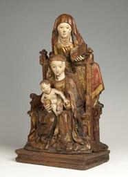 | Keywords: MCC-42227 Anna-te-Drieën (2).tif Artwork nl Anonymous Noord-Nederland Anonymous Utrecht nl Anna buigt zich over de rugleuning van de zetel waarop Maria is gezeten die het naakte kind op haar schoot houdt Anna draagt in haar linkerhand een opengeslagen boek Haar rechterhand houdt ze op Maria's rechterschouder Haar hoog opgetrokken linkerbeen staat op een bankje dat van achter de zetel zichtbaar is Het Christuskind laat zijn rechterhand rusten op de appel die Maria in haar rechterhand draagt Het heeft zich iets naar links gewend en laat zijn linkerhand rusten op de linkerarm van Maria Maria ondersteunt met haar linkerhand de opgetrokken beentjes van het kind en houdt zijn rechtervoetje vast Opvallend is de sterk gebogen stand van Maria's rechterbeen waarvan de knie naar binnen is gewend Haar voet lijkt uit haar slof te schieten Anna met hoofd- en kindoek draagt een lang kleed en een over het hoofd geslagen mantel Maria is gekleed in een lang gewaad en mantel en heeft een bloemenkrans om het hoofd Maria en Anna dragen sloffen met ronde neuzen Het kind heeft een geschilderde bloedkoralen ketting om de hals waaraan vroeger een kruisje eveneens geschilderd hing De zetel heeft een hoge brede rugleuning met verdiept middenveld omlijst door een geprofileerde rand en op de bovenhoeken uitkragende versieringen in de vorm van zeer gestileerde pinakels De lage armleuningen zijn aan de bovenzijde hol en aan de voorzijde voorzien van een bolprofiel waaronder een kwarthol en enkele rechte profielen Links en rechts in de voorzijde onder de leuningen een blindnis met twee toten Het bankje achter de zetel heeft een geprofileerde bovenrand De zetel is geplaatst op een grond met smalle parallelle groeven Het beeld staat op een losse rechthoekige geprofileerde plint waarin vier gaten met resten van de nagels voor de bevestiging aanwezig zijn De onderzijde van de plint is uitgehold Polychromie De polychromie is aangebracht op een dunne witte grond de vergulding op een geel-bruine bolus Het incarnaat is bijna wit met roze blossen Helderrode lippen Wimpers rimpels en plooien zijn heel gedetailleerd weergegeven in rose-bruine tinten Bij het kind zijn de details van de oren roze De vingernagels zijn wit met een rode rand Bij Maria en Anna zijn nog bruine irissen aanwezig De wenkbrauwen zijn bruin Het incarnaat van de gezichten wordt begrensd door een roze lijn; zo ook de halspartijen De haren van Maria en het kind zijn verguld Anna's kleed heeft een polimentvergulding De binnenkant van het kleed ter hoogte van de handen is rood met groefjes om bont te suggereren Langs de zoom een dubbele rode lijn Anna's mantel is rood met gouden rand en een zwarte bies tussen het rood en het goud De binnenkant van de mantel is azurietblauw op een zwarte grond De kindoek heeft een dubbele roze bies De doek zelf is wit of grijzig resten blauw pigment Het boek heeft een zwarte band witte bladen met zwarte letters rode beginkapitalen en pargraaftekens en is goud op snee De marges van de tekst zijn aangegeven met een rode lijn Maria heeft een goudkleurig gewaad met roodversierd boord en een brede versierde rand langs de mouwen Aan de binnenkant van de mouwen links groen en rechts groen en blauw De buitenzijde van de blauwe mantel heeft brede gouden boorden waarlangs een gouden lijn; erboven een schulpmotief met op elke punt drie stipjes waardoor een gestileerd bloemmotief ontstaat De binnenkant van de mantel is rood met een smalle gouden bies met zwarte belijning De bloemen van de krans hebben vergulde hartjes en vertonen verder sporen rood De appel vertoont sporen van vergulding en rood onderaan bij de hand van Maria en bij de vingers van het kind Het schoeisel is zwart de binnenkant van Maria's slof is geel haar kous rood Het middenveld van de leuning van de zetel vertoont een brokaatmotief met donkerbruine tot groenige lijnen op goud De spaarvelden in de blindnissen zijn roze de randen van de blindnissen verguld De profilering daarboven en onder afwisselend goud en roze De plint en de zijkanten van de zetel zijn bruin-rood de binnenzijde van de armleuningen roze-rood en de profielen goudkleurig Het zitgedeelte is roze De omlijsting van de rugleuning is gemarmerd in bruinige en zwarte en grijs-roodachtige tinten De knoppen boven op de rugleuningprofilering afwisselend goud en rose Over het algemeen zijn de terugliggende profielen roze en de uitspringende profielen verguld Het bankje van Anna lijkt rood-bruin Op de grond nog een klein restje geel-groen Op de achterzijde is het rood van Anna's mantel op haar hoofd en schouders en op haar linkerbeen doorgezet Techniek De achterzijde is vrij grof afgevlakt De kern ligt links in het werkblok Op het standvlak parallelle gutssporen Een kleine vierkant gaatje bovenin het hoofd van Anna In de rugleuning aan de voorzijde een noest Staat Afgebroken een stukje uit de bloemenkrans; het rechterbolprofiel van de stoelleuning; een hoek van het profiel daaronder; enkele delen uit de grond vooral links wat grotere stukken Scheurvorming vanuit de kern Een grote scheur in de voorzijde is dichtgezet met hout en kunsthars Een gaatje in de rug en twee moderne schroefgaten In het standvlak drie vierkante spijkergaten waarvan twee met resten van spijkers en een onregelmatig ondiep gat De polychromie is over de gehele oppervlakte beschadigd en gesleten vooral op het kleed van Maria between 1495 1504 nl eikenhout verf Size 51 0 29 0 cm nl Hoogte 51 0cm Breedte 29 0cm Diepte 18 0cm Institution Museum Catharijneconvent object history exhibition history credit line nl Foto Museum Catharijneconvent Utrecht foto Ruben de Heer accession number Object number 42227 Inventory number ABM bh00499 place of creation https //www catharijneconvent nl/adlib/42227/ View this work on the website of Museum Catharijneconvent Museum Catharijneconvent Cc-zero <gallery> File MCC-42227_Anna-te-Drieën_ 6 tif File MCC-42227_Anna-te-Drieën_ 1 tif File MCC-42227_Anna-te-Drieën_ 11 tif File MCC-42227_Anna-te-Drieën_ 3 ti
