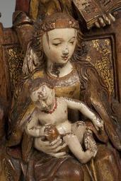| Keywords: MCC-42227 Anna-te-Drieën (4).tif Artwork nl Anonymous Noord-Nederland Anonymous Utrecht nl Anna buigt zich over de rugleuning van de zetel waarop Maria is gezeten die het naakte kind op haar schoot houdt Anna draagt in haar linkerhand een opengeslagen boek Haar rechterhand houdt ze op Maria's rechterschouder Haar hoog opgetrokken linkerbeen staat op een bankje dat van achter de zetel zichtbaar is Het Christuskind laat zijn rechterhand rusten op de appel die Maria in haar rechterhand draagt Het heeft zich iets naar links gewend en laat zijn linkerhand rusten op de linkerarm van Maria Maria ondersteunt met haar linkerhand de opgetrokken beentjes van het kind en houdt zijn rechtervoetje vast Opvallend is de sterk gebogen stand van Maria's rechterbeen waarvan de knie naar binnen is gewend Haar voet lijkt uit haar slof te schieten Anna met hoofd- en kindoek draagt een lang kleed en een over het hoofd geslagen mantel Maria is gekleed in een lang gewaad en mantel en heeft een bloemenkrans om het hoofd Maria en Anna dragen sloffen met ronde neuzen Het kind heeft een geschilderde bloedkoralen ketting om de hals waaraan vroeger een kruisje eveneens geschilderd hing De zetel heeft een hoge brede rugleuning met verdiept middenveld omlijst door een geprofileerde rand en op de bovenhoeken uitkragende versieringen in de vorm van zeer gestileerde pinakels De lage armleuningen zijn aan de bovenzijde hol en aan de voorzijde voorzien van een bolprofiel waaronder een kwarthol en enkele rechte profielen Links en rechts in de voorzijde onder de leuningen een blindnis met twee toten Het bankje achter de zetel heeft een geprofileerde bovenrand De zetel is geplaatst op een grond met smalle parallelle groeven Het beeld staat op een losse rechthoekige geprofileerde plint waarin vier gaten met resten van de nagels voor de bevestiging aanwezig zijn De onderzijde van de plint is uitgehold Polychromie De polychromie is aangebracht op een dunne witte grond de vergulding op een geel-bruine bolus Het incarnaat is bijna wit met roze blossen Helderrode lippen Wimpers rimpels en plooien zijn heel gedetailleerd weergegeven in rose-bruine tinten Bij het kind zijn de details van de oren roze De vingernagels zijn wit met een rode rand Bij Maria en Anna zijn nog bruine irissen aanwezig De wenkbrauwen zijn bruin Het incarnaat van de gezichten wordt begrensd door een roze lijn; zo ook de halspartijen De haren van Maria en het kind zijn verguld Anna's kleed heeft een polimentvergulding De binnenkant van het kleed ter hoogte van de handen is rood met groefjes om bont te suggereren Langs de zoom een dubbele rode lijn Anna's mantel is rood met gouden rand en een zwarte bies tussen het rood en het goud De binnenkant van de mantel is azurietblauw op een zwarte grond De kindoek heeft een dubbele roze bies De doek zelf is wit of grijzig resten blauw pigment Het boek heeft een zwarte band witte bladen met zwarte letters rode beginkapitalen en pargraaftekens en is goud op snee De marges van de tekst zijn aangegeven met een rode lijn Maria heeft een goudkleurig gewaad met roodversierd boord en een brede versierde rand langs de mouwen Aan de binnenkant van de mouwen links groen en rechts groen en blauw De buitenzijde van de blauwe mantel heeft brede gouden boorden waarlangs een gouden lijn; erboven een schulpmotief met op elke punt drie stipjes waardoor een gestileerd bloemmotief ontstaat De binnenkant van de mantel is rood met een smalle gouden bies met zwarte belijning De bloemen van de krans hebben vergulde hartjes en vertonen verder sporen rood De appel vertoont sporen van vergulding en rood onderaan bij de hand van Maria en bij de vingers van het kind Het schoeisel is zwart de binnenkant van Maria's slof is geel haar kous rood Het middenveld van de leuning van de zetel vertoont een brokaatmotief met donkerbruine tot groenige lijnen op goud De spaarvelden in de blindnissen zijn roze de randen van de blindnissen verguld De profilering daarboven en onder afwisselend goud en roze De plint en de zijkanten van de zetel zijn bruin-rood de binnenzijde van de armleuningen roze-rood en de profielen goudkleurig Het zitgedeelte is roze De omlijsting van de rugleuning is gemarmerd in bruinige en zwarte en grijs-roodachtige tinten De knoppen boven op de rugleuningprofilering afwisselend goud en rose Over het algemeen zijn de terugliggende profielen roze en de uitspringende profielen verguld Het bankje van Anna lijkt rood-bruin Op de grond nog een klein restje geel-groen Op de achterzijde is het rood van Anna's mantel op haar hoofd en schouders en op haar linkerbeen doorgezet Techniek De achterzijde is vrij grof afgevlakt De kern ligt links in het werkblok Op het standvlak parallelle gutssporen Een kleine vierkant gaatje bovenin het hoofd van Anna In de rugleuning aan de voorzijde een noest Staat Afgebroken een stukje uit de bloemenkrans; het rechterbolprofiel van de stoelleuning; een hoek van het profiel daaronder; enkele delen uit de grond vooral links wat grotere stukken Scheurvorming vanuit de kern Een grote scheur in de voorzijde is dichtgezet met hout en kunsthars Een gaatje in de rug en twee moderne schroefgaten In het standvlak drie vierkante spijkergaten waarvan twee met resten van spijkers en een onregelmatig ondiep gat De polychromie is over de gehele oppervlakte beschadigd en gesleten vooral op het kleed van Maria between 1495 1504 nl eikenhout verf Size 51 0 29 0 cm nl Hoogte 51 0cm Breedte 29 0cm Diepte 18 0cm Institution Museum Catharijneconvent object history exhibition history credit line nl Foto Museum Catharijneconvent Utrecht foto Ruben de Heer Reproduction title nl Detail accession number Object number 42227 Inventory number ABM bh00499 place of creation https //www catharijneconvent nl/adlib/42227/ View this work on the website of Museum Catharijneconvent Museum Catharijneconvent Cc-zero <gallery> File MCC-42227_Anna-te-Drieën_ 6 tif File MCC-42227_Anna-te-Drieën_ 1 tif File MCC-42227_Anna-te-Drieën_ 11 tif File MC