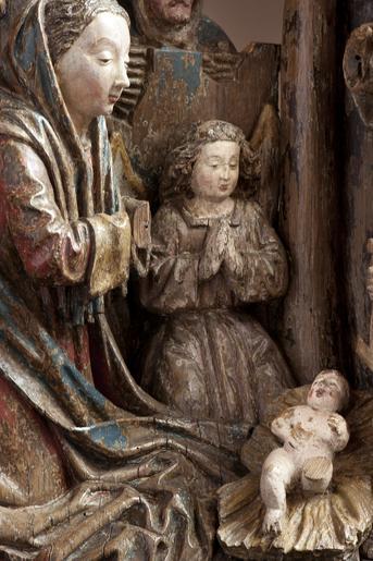 | Keywords: MCC-42318 Geboorte van Christus, aanbidding der herders (28).tif Artwork nl Anonymous Utrecht nl Voor een vervallen stal in het midden van de voorstelling knielt Maria links in aanbidding neer bij het kindje dat in het stro ligt Ook zijn twee engelen bij het kind neergeknield De ene en profil rechts op de voorgrond bespeelt een harp die hij voor zich houdt De andere zit schuin achter het kindje rechts van Maria en heeft zijn handen gevouwen voor zich Achter de harpspelende engel staat Jozef driekwart naar links gewend Hij kijkt wat voorovergebogen op het kind neer In zijn verdwenen linkerhand droeg hij waarschijnlijk een kaars waarvan hij het licht met zijn geheven rechter hand afschermde tegen de stralen die van het kind uitgaan Op de achtergrond rechts boven op een rots of heuvel staat een derde engel die met zijn rechterhand het kind aanwijst aan een klein afgebeelde herder die rechts naast hem loopt In de stal achter een met leem bestreken tenen wand kijkt nog een herder toe waarvan alleen het hoofd en de schouders zichtbaar zijn Het dak van de stal rust op vier pilaren In de voorzijde ervan is een rechthoekig venster aangebracht waarin twee duifjes zitten Tussen de twee linkerpilaren door hebben de os en de ezel hun koppen naar buiten gestoken Terwijl de os naar voren kijkt neemt de ezel een flinke hap stro uit de kribbe die voor hem staat Het linker gedeelte van de voorstelling wordt ingenomen door een grote rotsige heuvelpartij waarvoor een herder staat Hij heeft zijn bovenlichaam bijna en profil naar rechts gedraaid en zijn linkerbeen iets naar voren geplaatst en kijkt naar het geboortetafereel Hij leunt met beide handen op een herdersstaf die aan de onderzijde voorzien is van een schep De heuvelige bodem is afgewerkt met zigzaggroeven Maria draagt een lang gewaad Haar mantel is van haar rechterschouder gegleden tot op haar heupen en bedekt in soepele plooien de grond Haar kleed heeft omgeslagen mouwboorden Over haar hoofd een deels teruggeslagen sluier De engelen zijn gekleed in gegorde albes De achterste engel heeft een diadeem op het hoofd Aan de gordel rond Jozefs kleed hangt een rozenkrans Zijn mantel is teruggeslagen over zijn linker schouder Op zijn hoofd een kaproenachtig hoofddeksel en om zijn hals een grote sjaal De herder rechts op de achtergrond heeft een hoed met opgeslagen achterrand op het hoofd Hij draagt een korte gegorde tuniek met v-hals Aan zijn riem hangen een tas en een hoornachtig voorwerp Hij heeft puntig schoeisel en zijn kousen lijken afgerold Van de herder achter de wand is alleen te zien dat hij een kap draagt De linker herder is gekleed in een korte gegorde tuniek met kort ingesneden wambuis en lage schoenen met afgeronde neus Op zijn hoofd een hoed waar aan de linkerkant een doek onderuit hangt Zijn handen zijn in wanten gestoken Polychromie Het stuk is deels bedekt met oude maar niet oorspronkelijke polychromie De bruine retouches van de witte grond en de lacunes maken het moeilijk nog onderliggende lagen te onderscheiden Het stuk lijkt grondig schoongemaakt voordat het opnieuw is gestoffeerd Incarnaat lichtroze met rode blossen De herders vertonen een oranje-achtig incarnaat De ogen zijn gedetailleerd in zwart en bruin; monden helderrood Maria's haar is bruin haar sluier en binnenkant van de mantel blauw; buitenzijden mantel deels rood deels blauw verkeerd geïnterpreteerd door de stoffeerder ; gewaad rood met vergulde boorden De matte vergulding lijkt op een gelige grond te liggen De albes van de engelen zijn roze Hun haar matverguld op een gelige grond De harp is verguld De boorden van de albes zijn verguld Jozef haar bruin rand van de hoed verguld op gelige grond; slip rood; sjaal wit; kleed en rozenkrans rood; mantel bruin Kleine herder hoed rood; haar donkerbruin waaronder resten van oranjerood bolus ; kleed blauw; hoorn gordel en tas gelig; kousen en schoenen donkerrood Kap herder blauw met een witte rand Os rood tanden wit hoorns roze Ezel lichtbruin Stro geel Ruif lichtbruin waarop donkerbruin Herder links hoed blauw met rode slip; wambuis bruin met rode kraag manchetten en split; tuniek blauw waarop sporen vergulding; buidel lichtgeel; kousen wit; schoenen donkerbruin Onder het wit van de kousen mogelijk roze incarnaat Staf lichtbruin met blauwe schep Stal zuilen en achterwand rechts donkerbruin; strodak geelbruin; gevel donkerbruin met witte duifjes waarvan er een een rode snavel heeft; wand blauw; vleugels middelste geknielde engel wit met vergulde rand Heuvels resten geel bruin en groen Het geel ligt deels over het groen Rotsen links bovenaan heel lichtroze waaronder vergulding op rood-achtige bolus Techniek De groep is uit meerdere delen samengesteld Het rechtergedeelte met de stal Maria Jozef en de engelen vormt één geheel uitgezonderd de rechts op de voorgrond knielende engel en het kindje op het stro De kern lag achter het werkblok Aan dit gedeelte zijn toegevoegd het rechterduifje in de stal genoemd kindje en engel en de grond onder de engel De figuren op de voorgrond zijn rondom bewerkt Het linkergedeelte met de rotsen en de grote herderfiguur vormt één geheel De herder is bijna rondom uitgewerkt De twee delen zijn aan elkaar gezet door middel van houten pennen en verbindingsplankjes die met grote nagels in de onderzijde van de delen zijn bevestigd Ook bovenaan de achterzijde bevindt zich een origineel verbindingsplankje vastgezet met zes gesmede nagels twee verdwenen Mogelijk liep dit plankje verder door naar links waar nog twee gesmede nagels aanwezig zijn Een deel van de grond tussen beide delen vormt eveneens een verbinding en is met twee houten pennen en een ijzeren nagel in de voorzijde vastgezet De grond onder de engel is met houten pennen en een metalen nagel bevestigd Het kind is op de grond gelijmd en ingepend De harp bestaat uit twee delen De linkerhand van de linkerengel vormt één geheel met de snaren De delen lijken gelijmd en daarna met een grote nagel onderaan in de engel vastgezet Het rechter duif