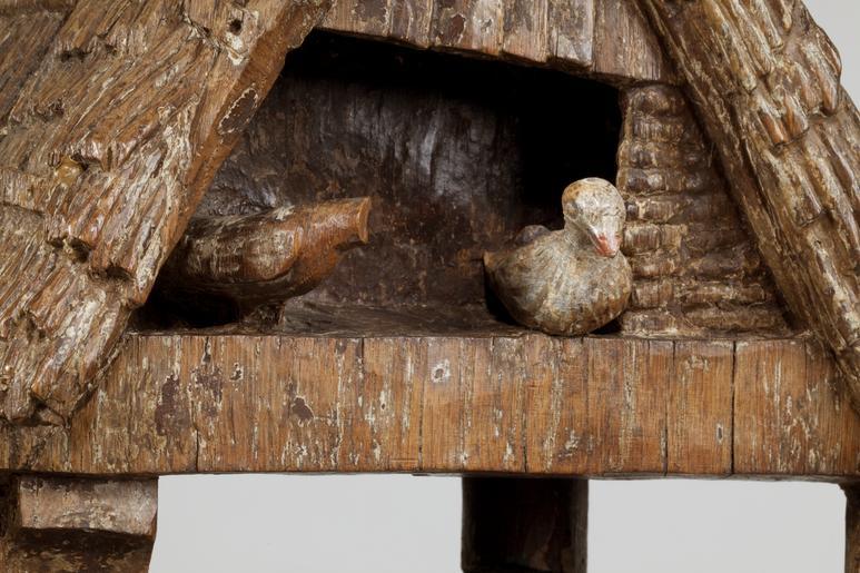 | Keywords: MCC-42318 Geboorte van Christus, aanbidding der herders (12).tif Artwork nl Anonymous Utrecht nl Voor een vervallen stal in het midden van de voorstelling knielt Maria links in aanbidding neer bij het kindje dat in het stro ligt Ook zijn twee engelen bij het kind neergeknield De ene en profil rechts op de voorgrond bespeelt een harp die hij voor zich houdt De andere zit schuin achter het kindje rechts van Maria en heeft zijn handen gevouwen voor zich Achter de harpspelende engel staat Jozef driekwart naar links gewend Hij kijkt wat voorovergebogen op het kind neer In zijn verdwenen linkerhand droeg hij waarschijnlijk een kaars waarvan hij het licht met zijn geheven rechter hand afschermde tegen de stralen die van het kind uitgaan Op de achtergrond rechts boven op een rots of heuvel staat een derde engel die met zijn rechterhand het kind aanwijst aan een klein afgebeelde herder die rechts naast hem loopt In de stal achter een met leem bestreken tenen wand kijkt nog een herder toe waarvan alleen het hoofd en de schouders zichtbaar zijn Het dak van de stal rust op vier pilaren In de voorzijde ervan is een rechthoekig venster aangebracht waarin twee duifjes zitten Tussen de twee linkerpilaren door hebben de os en de ezel hun koppen naar buiten gestoken Terwijl de os naar voren kijkt neemt de ezel een flinke hap stro uit de kribbe die voor hem staat Het linker gedeelte van de voorstelling wordt ingenomen door een grote rotsige heuvelpartij waarvoor een herder staat Hij heeft zijn bovenlichaam bijna en profil naar rechts gedraaid en zijn linkerbeen iets naar voren geplaatst en kijkt naar het geboortetafereel Hij leunt met beide handen op een herdersstaf die aan de onderzijde voorzien is van een schep De heuvelige bodem is afgewerkt met zigzaggroeven Maria draagt een lang gewaad Haar mantel is van haar rechterschouder gegleden tot op haar heupen en bedekt in soepele plooien de grond Haar kleed heeft omgeslagen mouwboorden Over haar hoofd een deels teruggeslagen sluier De engelen zijn gekleed in gegorde albes De achterste engel heeft een diadeem op het hoofd Aan de gordel rond Jozefs kleed hangt een rozenkrans Zijn mantel is teruggeslagen over zijn linker schouder Op zijn hoofd een kaproenachtig hoofddeksel en om zijn hals een grote sjaal De herder rechts op de achtergrond heeft een hoed met opgeslagen achterrand op het hoofd Hij draagt een korte gegorde tuniek met v-hals Aan zijn riem hangen een tas en een hoornachtig voorwerp Hij heeft puntig schoeisel en zijn kousen lijken afgerold Van de herder achter de wand is alleen te zien dat hij een kap draagt De linker herder is gekleed in een korte gegorde tuniek met kort ingesneden wambuis en lage schoenen met afgeronde neus Op zijn hoofd een hoed waar aan de linkerkant een doek onderuit hangt Zijn handen zijn in wanten gestoken Polychromie Het stuk is deels bedekt met oude maar niet oorspronkelijke polychromie De bruine retouches van de witte grond en de lacunes maken het moeilijk nog onderliggende lagen te onderscheiden Het stuk lijkt grondig schoongemaakt voordat het opnieuw is gestoffeerd Incarnaat lichtroze met rode blossen De herders vertonen een oranje-achtig incarnaat De ogen zijn gedetailleerd in zwart en bruin; monden helderrood Maria's haar is bruin haar sluier en binnenkant van de mantel blauw; buitenzijden mantel deels rood deels blauw verkeerd geïnterpreteerd door de stoffeerder ; gewaad rood met vergulde boorden De matte vergulding lijkt op een gelige grond te liggen De albes van de engelen zijn roze Hun haar matverguld op een gelige grond De harp is verguld De boorden van de albes zijn verguld Jozef haar bruin rand van de hoed verguld op gelige grond; slip rood; sjaal wit; kleed en rozenkrans rood; mantel bruin Kleine herder hoed rood; haar donkerbruin waaronder resten van oranjerood bolus ; kleed blauw; hoorn gordel en tas gelig; kousen en schoenen donkerrood Kap herder blauw met een witte rand Os rood tanden wit hoorns roze Ezel lichtbruin Stro geel Ruif lichtbruin waarop donkerbruin Herder links hoed blauw met rode slip; wambuis bruin met rode kraag manchetten en split; tuniek blauw waarop sporen vergulding; buidel lichtgeel; kousen wit; schoenen donkerbruin Onder het wit van de kousen mogelijk roze incarnaat Staf lichtbruin met blauwe schep Stal zuilen en achterwand rechts donkerbruin; strodak geelbruin; gevel donkerbruin met witte duifjes waarvan er een een rode snavel heeft; wand blauw; vleugels middelste geknielde engel wit met vergulde rand Heuvels resten geel bruin en groen Het geel ligt deels over het groen Rotsen links bovenaan heel lichtroze waaronder vergulding op rood-achtige bolus Techniek De groep is uit meerdere delen samengesteld Het rechtergedeelte met de stal Maria Jozef en de engelen vormt één geheel uitgezonderd de rechts op de voorgrond knielende engel en het kindje op het stro De kern lag achter het werkblok Aan dit gedeelte zijn toegevoegd het rechterduifje in de stal genoemd kindje en engel en de grond onder de engel De figuren op de voorgrond zijn rondom bewerkt Het linkergedeelte met de rotsen en de grote herderfiguur vormt één geheel De herder is bijna rondom uitgewerkt De twee delen zijn aan elkaar gezet door middel van houten pennen en verbindingsplankjes die met grote nagels in de onderzijde van de delen zijn bevestigd Ook bovenaan de achterzijde bevindt zich een origineel verbindingsplankje vastgezet met zes gesmede nagels twee verdwenen Mogelijk liep dit plankje verder door naar links waar nog twee gesmede nagels aanwezig zijn Een deel van de grond tussen beide delen vormt eveneens een verbinding en is met twee houten pennen en een ijzeren nagel in de voorzijde vastgezet De grond onder de engel is met houten pennen en een metalen nagel bevestigd Het kind is op de grond gelijmd en ingepend De harp bestaat uit twee delen De linkerhand van de linkerengel vormt één geheel met de snaren De delen lijken gelijmd en daarna met een grote nagel onderaan in de engel vastgezet Het rechter duif
