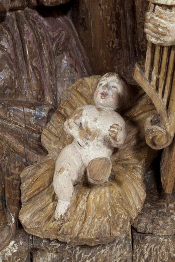 | Keywords: MCC-42318 Geboorte van Christus, aanbidding der herders (3).tif Artwork nl Anonymous Utrecht nl Voor een vervallen stal in het midden van de voorstelling knielt Maria links in aanbidding neer bij het kindje dat in het stro ligt Ook zijn twee engelen bij het kind neergeknield De ene en profil rechts op de voorgrond bespeelt een harp die hij voor zich houdt De andere zit schuin achter het kindje rechts van Maria en heeft zijn handen gevouwen voor zich Achter de harpspelende engel staat Jozef driekwart naar links gewend Hij kijkt wat voorovergebogen op het kind neer In zijn verdwenen linkerhand droeg hij waarschijnlijk een kaars waarvan hij het licht met zijn geheven rechter hand afschermde tegen de stralen die van het kind uitgaan Op de achtergrond rechts boven op een rots of heuvel staat een derde engel die met zijn rechterhand het kind aanwijst aan een klein afgebeelde herder die rechts naast hem loopt In de stal achter een met leem bestreken tenen wand kijkt nog een herder toe waarvan alleen het hoofd en de schouders zichtbaar zijn Het dak van de stal rust op vier pilaren In de voorzijde ervan is een rechthoekig venster aangebracht waarin twee duifjes zitten Tussen de twee linkerpilaren door hebben de os en de ezel hun koppen naar buiten gestoken Terwijl de os naar voren kijkt neemt de ezel een flinke hap stro uit de kribbe die voor hem staat Het linker gedeelte van de voorstelling wordt ingenomen door een grote rotsige heuvelpartij waarvoor een herder staat Hij heeft zijn bovenlichaam bijna en profil naar rechts gedraaid en zijn linkerbeen iets naar voren geplaatst en kijkt naar het geboortetafereel Hij leunt met beide handen op een herdersstaf die aan de onderzijde voorzien is van een schep De heuvelige bodem is afgewerkt met zigzaggroeven Maria draagt een lang gewaad Haar mantel is van haar rechterschouder gegleden tot op haar heupen en bedekt in soepele plooien de grond Haar kleed heeft omgeslagen mouwboorden Over haar hoofd een deels teruggeslagen sluier De engelen zijn gekleed in gegorde albes De achterste engel heeft een diadeem op het hoofd Aan de gordel rond Jozefs kleed hangt een rozenkrans Zijn mantel is teruggeslagen over zijn linker schouder Op zijn hoofd een kaproenachtig hoofddeksel en om zijn hals een grote sjaal De herder rechts op de achtergrond heeft een hoed met opgeslagen achterrand op het hoofd Hij draagt een korte gegorde tuniek met v-hals Aan zijn riem hangen een tas en een hoornachtig voorwerp Hij heeft puntig schoeisel en zijn kousen lijken afgerold Van de herder achter de wand is alleen te zien dat hij een kap draagt De linker herder is gekleed in een korte gegorde tuniek met kort ingesneden wambuis en lage schoenen met afgeronde neus Op zijn hoofd een hoed waar aan de linkerkant een doek onderuit hangt Zijn handen zijn in wanten gestoken Polychromie Het stuk is deels bedekt met oude maar niet oorspronkelijke polychromie De bruine retouches van de witte grond en de lacunes maken het moeilijk nog onderliggende lagen te onderscheiden Het stuk lijkt grondig schoongemaakt voordat het opnieuw is gestoffeerd Incarnaat lichtroze met rode blossen De herders vertonen een oranje-achtig incarnaat De ogen zijn gedetailleerd in zwart en bruin; monden helderrood Maria's haar is bruin haar sluier en binnenkant van de mantel blauw; buitenzijden mantel deels rood deels blauw verkeerd geïnterpreteerd door de stoffeerder ; gewaad rood met vergulde boorden De matte vergulding lijkt op een gelige grond te liggen De albes van de engelen zijn roze Hun haar matverguld op een gelige grond De harp is verguld De boorden van de albes zijn verguld Jozef haar bruin rand van de hoed verguld op gelige grond; slip rood; sjaal wit; kleed en rozenkrans rood; mantel bruin Kleine herder hoed rood; haar donkerbruin waaronder resten van oranjerood bolus ; kleed blauw; hoorn gordel en tas gelig; kousen en schoenen donkerrood Kap herder blauw met een witte rand Os rood tanden wit hoorns roze Ezel lichtbruin Stro geel Ruif lichtbruin waarop donkerbruin Herder links hoed blauw met rode slip; wambuis bruin met rode kraag manchetten en split; tuniek blauw waarop sporen vergulding; buidel lichtgeel; kousen wit; schoenen donkerbruin Onder het wit van de kousen mogelijk roze incarnaat Staf lichtbruin met blauwe schep Stal zuilen en achterwand rechts donkerbruin; strodak geelbruin; gevel donkerbruin met witte duifjes waarvan er een een rode snavel heeft; wand blauw; vleugels middelste geknielde engel wit met vergulde rand Heuvels resten geel bruin en groen Het geel ligt deels over het groen Rotsen links bovenaan heel lichtroze waaronder vergulding op rood-achtige bolus Techniek De groep is uit meerdere delen samengesteld Het rechtergedeelte met de stal Maria Jozef en de engelen vormt één geheel uitgezonderd de rechts op de voorgrond knielende engel en het kindje op het stro De kern lag achter het werkblok Aan dit gedeelte zijn toegevoegd het rechterduifje in de stal genoemd kindje en engel en de grond onder de engel De figuren op de voorgrond zijn rondom bewerkt Het linkergedeelte met de rotsen en de grote herderfiguur vormt één geheel De herder is bijna rondom uitgewerkt De twee delen zijn aan elkaar gezet door middel van houten pennen en verbindingsplankjes die met grote nagels in de onderzijde van de delen zijn bevestigd Ook bovenaan de achterzijde bevindt zich een origineel verbindingsplankje vastgezet met zes gesmede nagels twee verdwenen Mogelijk liep dit plankje verder door naar links waar nog twee gesmede nagels aanwezig zijn Een deel van de grond tussen beide delen vormt eveneens een verbinding en is met twee houten pennen en een ijzeren nagel in de voorzijde vastgezet De grond onder de engel is met houten pennen en een metalen nagel bevestigd Het kind is op de grond gelijmd en ingepend De harp bestaat uit twee delen De linkerhand van de linkerengel vormt één geheel met de snaren De delen lijken gelijmd en daarna met een grote nagel onderaan in de engel vastgezet Het rechter duifj