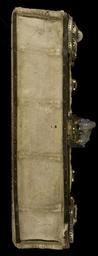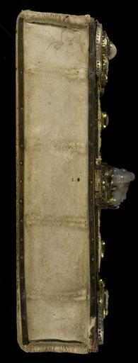 | Keywords: MCC-61050 Evangeliarium (Lebuïnuscodex) (332).jpg  Artwork nl Anonymous Noordoost-Frankrijk Anonymous Rijnland Anonymous Maasland nl De kern van de boekband van de Lebuïnuscodex wordt gevormd door twee eikenhouten platten De rug en het achterplat zijn overtrokken met zeemleer Het voorplat is rijkelijk versierd met verguld zilversmeedwerk reliëfs van walrustand en verscheidene stenen De compositie van de bekleding van het voorplat wordt bepaald door een verguld zilveren filigraankruis Aan de uiteinden van de kruisarmen bevinden zich vierpassen met overhoeks vierkant eveneens met filigraan gedecoreerd Hiervan zijn er slechts twee bewaard gebleven en wel die aan de verticale kruisarmen Zij bevatten tevens nog de oorspronkelijke versiering bestaande uit een filigraanmedaillon met een pseudo-camee van respectievelijk een mannen- en een vrouwenhoofd in profiel Het snijpunt van het kruis wordt ingenomen door een ver vooruitstekend Bacchuskopje in chalcedoon te herkennen aan de kleine druiventrosjes in zijn haartooi Het kopje is gevat in een filigraanmedaillon welke op zijn beurt weer is geplaatst op een vierpas van filigraanwerk Op elk van de kruisarmen bevindt zich een ovale steen 'en cabochon' op een medaillon met filigraan Het filigraanwerk van kruis en sierstukken is in de vorm van visblazen In de ruimten tussen de kruisarmen zijn rechthoekige reliëfs van walrustand aangebracht met de vier evangelisten en hun symbool De reliëfs hebben de volgende afmetingen H 10 0 x B 5 5 cm Van links boven naar rechts onder betreft het Mattheus met de engel Johannes met de adelaar Marcus met de gevleugelde leeuw en Lucas met de gevleugelde os De figuren zijn paarsgewijs als elkaars spiegelbeeld ten opzichte van de middenas geplaatst Mattheus en Johannes zitten vrijwel geheel frontaal terwijl Marcus en Lucas meer in profiel zijn afgebeeld Qua opbouw verschillen de vier reliëfs nauwelijks van elkaar Binnen een rand van vierlobbige blaadjes verheffen zich twee zuilen met een basis een kapiteel en een dekplaat Hierop rust een rondboog geflankeerd door twee torens en afgedekt met een fronton dat boven Mattheus en Johannes boogvormig en boven Marcus en Lucas driehoekig is Onder deze overhuiving zitten de evangelisten gekleed in een lang gewaad en mantel met gekruiste benen aan een lessenaar hun blote voeten rustend op een bankje Allen zijn baardeloos en voorzien van een nimbus Voorts houden ze een pen in hun rechterhand terwijl hun linker op een boek ligt of gebarend is opgeheven Boven elk van de evangelisten verschijnt in de opening van het fronton zijn symbool met een spreukband Dit rijkelijk gedecoreerde middenveld wordt omlijst door sierbanden van verguld koper De opbouw van de sierlijsten is steeds dezelfde een opstaande smalle band die op regelmatige afstanden is voorzien van holten met aan weerszijden een brede strook voorzien van een gestanst motief Aan de lange zijden van de boekband bestaat het motief uit palmetten aan de korte zijden uit rozetten Van deze laatstgenoemde stroken ontbreekt steeds de buitenste rand Bij alle stroken met palmettenmotief wijzen de palmetten naar links met uitzondering van de buitenste strook rechtsboven die het motief in tegengestelde richting toont Verguld zilveren rozetten op de hoeken van het voorplat omgeven door een smalle rand van filigraanwerk met cirkelmotief en bekroond met een 'en cabochon' gezette steen completeren het geheel Van de rozet links onder ontbreekt de steen en is slechts de buitenste rand over Aan de voorzijde van de boekband bevinden zich nog de rudimenten van twee sluitingen between u'825' u'1000' u'1150' u'850' u'1199' u'1199' nl perkament eikenhout zilver goud koper walrustand chalcedoon glas leer Size 35 5 26 0 cm nl Hoogte 35 5cm Breedte 26 0cm Diepte 13 5cm Institution Museum Catharijneconvent object history exhibition history credit line nl Foto Museum Catharijneconvent Utrecht foto HetFotoAtelier Peter Rothengatter Reproduction title nl Boekband rug accession number Object number 61050 Inventory number ABM h1 place of creation https //www catharijneconvent nl/adlib/61050/ View this work on the website of Museum Catharijneconvent Museum Catharijneconvent Cc-zero <gallery> File MCC-61050_Evangeliarium_Lebuïnuscodex_ 11 jpg File MCC-61050_Evangeliarium_Lebuïnuscodex_ 172 jpg File MCC-61050_Evangeliarium_Lebuïnuscodex_ 212 jpg File MCC-61050_Evangeliarium_Lebuïnuscodex_ 61 jpg File MCC-61050_Evangeliarium_Lebuïnuscodex_ 12 jpg File MCC-61050_Evangeliarium_Lebuïnuscodex_ 213 jpg File MCC-61050_Evangeliarium_Lebuïnuscodex_ 56 jpg File MCC-61050_Evangeliarium_Lebuïnuscodex_ 232 jpg File MCC-61050_Evangeliarium_Lebuïnuscodex_ 93 jpg File MCC-61050_Evangeliarium_Lebuïnuscodex_ 99 jpg File MCC-61050_Evangeliarium_Lebuïnuscodex_ 184 jpg File MCC-61050_Evangeliarium_Lebuïnuscodex_ 64 jpg File MCC-61050_Evangeliarium_Lebuïnuscodex_ 299 jpg File MCC-61050_Evangeliarium_Lebuïnuscodex_ 86 jpg File MCC-61050_Evangeliarium_Lebuïnuscodex_ 260 jpg File MCC-61050_Evangeliarium_Lebuïnuscodex_ 159 jpg File MCC-61050_Evangeliarium_Lebuïnuscodex_ 247 jpg File MCC-61050_Evangeliarium_Lebuïnuscodex_ 180 jpg File MCC-61050_Evangeliarium_Lebuïnuscodex_ 121 jpg File MCC-61050_Evangeliarium_Lebuïnuscodex_ 315 jpg File MCC-61050_Evangeliarium_Lebuïnuscodex_ 284 jpg File MCC-61050_Evangeliarium_Lebuïnuscodex_ 33 jpg File MCC-61050_Evangeliarium_Lebuïnuscodex_ 44 jpg File MCC-61050_Evangeliarium_Lebuïnuscodex_ 258 jpg File MCC-61050_Evangeliarium_Lebuïnuscodex_ 237 jpg File MCC-61050_Evangeliarium_Lebuïnuscodex_ 20 jpg File MCC-61050_Evangeliarium_Lebuïnuscodex_ 220 jpg File MCC-61050_Evangeliarium_Lebuïnuscodex_ 279 jpg File MCC-61050_Evangeliarium_Lebuïnuscodex_ 183 jpg File MCC-61050_Evangeliarium_Lebuïnuscodex_ 60 jpg File MCC-61050_Evangeliarium_Lebuïnuscodex_ 166 jpg File MCC-61050_Evangeliarium_Lebuïnuscodex_ 97 jpg File MCC-61050_Evangeliarium_Lebuïnuscodex_ 71 jpg File MCC-61050_Evangeliarium_Lebuïnuscodex_ 132 jpg 