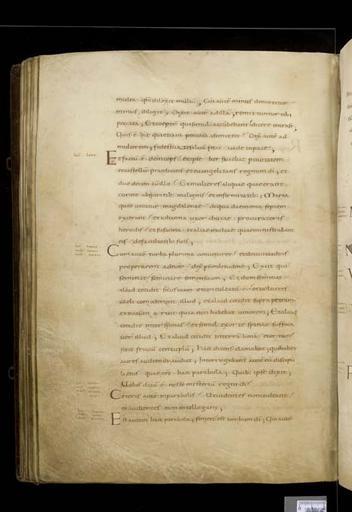 | Keywords: MCC-61050 Evangeliarium (Lebuïnuscodex) (167).jpg Artwork nl Anonymous Noordoost-Frankrijk Anonymous Rijnland Anonymous Maasland nl De kern van de boekband van de Lebuïnuscodex wordt gevormd door twee eikenhouten platten De rug en het achterplat zijn overtrokken met zeemleer Het voorplat is rijkelijk versierd met verguld zilversmeedwerk reliëfs van walrustand en verscheidene stenen De compositie van de bekleding van het voorplat wordt bepaald door een verguld zilveren filigraankruis Aan de uiteinden van de kruisarmen bevinden zich vierpassen met overhoeks vierkant eveneens met filigraan gedecoreerd Hiervan zijn er slechts twee bewaard gebleven en wel die aan de verticale kruisarmen Zij bevatten tevens nog de oorspronkelijke versiering bestaande uit een filigraanmedaillon met een pseudo-camee van respectievelijk een mannen- en een vrouwenhoofd in profiel Het snijpunt van het kruis wordt ingenomen door een ver vooruitstekend Bacchuskopje in chalcedoon te herkennen aan de kleine druiventrosjes in zijn haartooi Het kopje is gevat in een filigraanmedaillon welke op zijn beurt weer is geplaatst op een vierpas van filigraanwerk Op elk van de kruisarmen bevindt zich een ovale steen 'en cabochon' op een medaillon met filigraan Het filigraanwerk van kruis en sierstukken is in de vorm van visblazen In de ruimten tussen de kruisarmen zijn rechthoekige reliëfs van walrustand aangebracht met de vier evangelisten en hun symbool De reliëfs hebben de volgende afmetingen H 10 0 x B 5 5 cm Van links boven naar rechts onder betreft het Mattheus met de engel Johannes met de adelaar Marcus met de gevleugelde leeuw en Lucas met de gevleugelde os De figuren zijn paarsgewijs als elkaars spiegelbeeld ten opzichte van de middenas geplaatst Mattheus en Johannes zitten vrijwel geheel frontaal terwijl Marcus en Lucas meer in profiel zijn afgebeeld Qua opbouw verschillen de vier reliëfs nauwelijks van elkaar Binnen een rand van vierlobbige blaadjes verheffen zich twee zuilen met een basis een kapiteel en een dekplaat Hierop rust een rondboog geflankeerd door twee torens en afgedekt met een fronton dat boven Mattheus en Johannes boogvormig en boven Marcus en Lucas driehoekig is Onder deze overhuiving zitten de evangelisten gekleed in een lang gewaad en mantel met gekruiste benen aan een lessenaar hun blote voeten rustend op een bankje Allen zijn baardeloos en voorzien van een nimbus Voorts houden ze een pen in hun rechterhand terwijl hun linker op een boek ligt of gebarend is opgeheven Boven elk van de evangelisten verschijnt in de opening van het fronton zijn symbool met een spreukband Dit rijkelijk gedecoreerde middenveld wordt omlijst door sierbanden van verguld koper De opbouw van de sierlijsten is steeds dezelfde een opstaande smalle band die op regelmatige afstanden is voorzien van holten met aan weerszijden een brede strook voorzien van een gestanst motief Aan de lange zijden van de boekband bestaat het motief uit palmetten aan de korte zijden uit rozetten Van deze laatstgenoemde stroken ontbreekt steeds de buitenste rand Bij alle stroken met palmettenmotief wijzen de palmetten naar links met uitzondering van de buitenste strook rechtsboven die het motief in tegengestelde richting toont Verguld zilveren rozetten op de hoeken van het voorplat omgeven door een smalle rand van filigraanwerk met cirkelmotief en bekroond met een 'en cabochon' gezette steen completeren het geheel Van de rozet links onder ontbreekt de steen en is slechts de buitenste rand over Aan de voorzijde van de boekband bevinden zich nog de rudimenten van twee sluitingen between u'825' u'1000' u'1150' u'850' u'1199' u'1199' nl perkament eikenhout zilver goud koper walrustand chalcedoon glas leer Size 35 5 26 0 cm nl Hoogte 35 5cm Breedte 26 0cm Diepte 13 5cm Institution Museum Catharijneconvent object history exhibition history credit line nl Foto Museum Catharijneconvent Utrecht foto HetFotoAtelier Peter Rothengatter accession number Object number 61050 Inventory number ABM h1 place of creation https //www catharijneconvent nl/adlib/61050/ View this work on the website of Museum Catharijneconvent Museum Catharijneconvent Cc-zero <gallery> File MCC-61050_Evangeliarium_Lebuïnuscodex_ 11 jpg File MCC-61050_Evangeliarium_Lebuïnuscodex_ 172 jpg File MCC-61050_Evangeliarium_Lebuïnuscodex_ 212 jpg File MCC-61050_Evangeliarium_Lebuïnuscodex_ 61 jpg File MCC-61050_Evangeliarium_Lebuïnuscodex_ 12 jpg File MCC-61050_Evangeliarium_Lebuïnuscodex_ 213 jpg File MCC-61050_Evangeliarium_Lebuïnuscodex_ 56 jpg File MCC-61050_Evangeliarium_Lebuïnuscodex_ 232 jpg File MCC-61050_Evangeliarium_Lebuïnuscodex_ 93 jpg File MCC-61050_Evangeliarium_Lebuïnuscodex_ 99 jpg File MCC-61050_Evangeliarium_Lebuïnuscodex_ 184 jpg File MCC-61050_Evangeliarium_Lebuïnuscodex_ 64 jpg File MCC-61050_Evangeliarium_Lebuïnuscodex_ 299 jpg File MCC-61050_Evangeliarium_Lebuïnuscodex_ 86 jpg File MCC-61050_Evangeliarium_Lebuïnuscodex_ 260 jpg File MCC-61050_Evangeliarium_Lebuïnuscodex_ 159 jpg File MCC-61050_Evangeliarium_Lebuïnuscodex_ 247 jpg File MCC-61050_Evangeliarium_Lebuïnuscodex_ 180 jpg File MCC-61050_Evangeliarium_Lebuïnuscodex_ 121 jpg File MCC-61050_Evangeliarium_Lebuïnuscodex_ 315 jpg File MCC-61050_Evangeliarium_Lebuïnuscodex_ 284 jpg File MCC-61050_Evangeliarium_Lebuïnuscodex_ 33 jpg File MCC-61050_Evangeliarium_Lebuïnuscodex_ 44 jpg File MCC-61050_Evangeliarium_Lebuïnuscodex_ 258 jpg File MCC-61050_Evangeliarium_Lebuïnuscodex_ 237 jpg File MCC-61050_Evangeliarium_Lebuïnuscodex_ 20 jpg File MCC-61050_Evangeliarium_Lebuïnuscodex_ 220 jpg File MCC-61050_Evangeliarium_Lebuïnuscodex_ 279 jpg File MCC-61050_Evangeliarium_Lebuïnuscodex_ 183 jpg File MCC-61050_Evangeliarium_Lebuïnuscodex_ 60 jpg File MCC-61050_Evangeliarium_Lebuïnuscodex_ 166 jpg File MCC-61050_Evangeliarium_Lebuïnuscodex_ 97 jpg File MCC-61050_Evangeliarium_Lebuïnuscodex_ 71 jpg File MCC-61050_Evangeliarium_Lebuïnuscodex_ 132 jpg File MCC-61050_Evangeliarium_Lebuïn