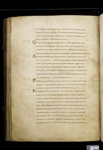 | Keywords: MCC-61050 Evangeliarium (Lebuïnuscodex) (138).jpg Artwork nl Anonymous Noordoost-Frankrijk Anonymous Rijnland Anonymous Maasland nl De kern van de boekband van de Lebuïnuscodex wordt gevormd door twee eikenhouten platten De rug en het achterplat zijn overtrokken met zeemleer Het voorplat is rijkelijk versierd met verguld zilversmeedwerk reliëfs van walrustand en verscheidene stenen De compositie van de bekleding van het voorplat wordt bepaald door een verguld zilveren filigraankruis Aan de uiteinden van de kruisarmen bevinden zich vierpassen met overhoeks vierkant eveneens met filigraan gedecoreerd Hiervan zijn er slechts twee bewaard gebleven en wel die aan de verticale kruisarmen Zij bevatten tevens nog de oorspronkelijke versiering bestaande uit een filigraanmedaillon met een pseudo-camee van respectievelijk een mannen- en een vrouwenhoofd in profiel Het snijpunt van het kruis wordt ingenomen door een ver vooruitstekend Bacchuskopje in chalcedoon te herkennen aan de kleine druiventrosjes in zijn haartooi Het kopje is gevat in een filigraanmedaillon welke op zijn beurt weer is geplaatst op een vierpas van filigraanwerk Op elk van de kruisarmen bevindt zich een ovale steen 'en cabochon' op een medaillon met filigraan Het filigraanwerk van kruis en sierstukken is in de vorm van visblazen In de ruimten tussen de kruisarmen zijn rechthoekige reliëfs van walrustand aangebracht met de vier evangelisten en hun symbool De reliëfs hebben de volgende afmetingen H 10 0 x B 5 5 cm Van links boven naar rechts onder betreft het Mattheus met de engel Johannes met de adelaar Marcus met de gevleugelde leeuw en Lucas met de gevleugelde os De figuren zijn paarsgewijs als elkaars spiegelbeeld ten opzichte van de middenas geplaatst Mattheus en Johannes zitten vrijwel geheel frontaal terwijl Marcus en Lucas meer in profiel zijn afgebeeld Qua opbouw verschillen de vier reliëfs nauwelijks van elkaar Binnen een rand van vierlobbige blaadjes verheffen zich twee zuilen met een basis een kapiteel en een dekplaat Hierop rust een rondboog geflankeerd door twee torens en afgedekt met een fronton dat boven Mattheus en Johannes boogvormig en boven Marcus en Lucas driehoekig is Onder deze overhuiving zitten de evangelisten gekleed in een lang gewaad en mantel met gekruiste benen aan een lessenaar hun blote voeten rustend op een bankje Allen zijn baardeloos en voorzien van een nimbus Voorts houden ze een pen in hun rechterhand terwijl hun linker op een boek ligt of gebarend is opgeheven Boven elk van de evangelisten verschijnt in de opening van het fronton zijn symbool met een spreukband Dit rijkelijk gedecoreerde middenveld wordt omlijst door sierbanden van verguld koper De opbouw van de sierlijsten is steeds dezelfde een opstaande smalle band die op regelmatige afstanden is voorzien van holten met aan weerszijden een brede strook voorzien van een gestanst motief Aan de lange zijden van de boekband bestaat het motief uit palmetten aan de korte zijden uit rozetten Van deze laatstgenoemde stroken ontbreekt steeds de buitenste rand Bij alle stroken met palmettenmotief wijzen de palmetten naar links met uitzondering van de buitenste strook rechtsboven die het motief in tegengestelde richting toont Verguld zilveren rozetten op de hoeken van het voorplat omgeven door een smalle rand van filigraanwerk met cirkelmotief en bekroond met een 'en cabochon' gezette steen completeren het geheel Van de rozet links onder ontbreekt de steen en is slechts de buitenste rand over Aan de voorzijde van de boekband bevinden zich nog de rudimenten van twee sluitingen between u'825' u'1000' u'1150' u'850' u'1199' u'1199' nl perkament eikenhout zilver goud koper walrustand chalcedoon glas leer Size 35 5 26 0 cm nl Hoogte 35 5cm Breedte 26 0cm Diepte 13 5cm Institution Museum Catharijneconvent object history exhibition history credit line nl Foto Museum Catharijneconvent Utrecht foto HetFotoAtelier Peter Rothengatter accession number Object number 61050 Inventory number ABM h1 place of creation https //www catharijneconvent nl/adlib/61050/ View this work on the website of Museum Catharijneconvent Museum Catharijneconvent Cc-zero <gallery> File MCC-61050_Evangeliarium_Lebuïnuscodex_ 11 jpg File MCC-61050_Evangeliarium_Lebuïnuscodex_ 172 jpg File MCC-61050_Evangeliarium_Lebuïnuscodex_ 212 jpg File MCC-61050_Evangeliarium_Lebuïnuscodex_ 61 jpg File MCC-61050_Evangeliarium_Lebuïnuscodex_ 12 jpg File MCC-61050_Evangeliarium_Lebuïnuscodex_ 213 jpg File MCC-61050_Evangeliarium_Lebuïnuscodex_ 56 jpg File MCC-61050_Evangeliarium_Lebuïnuscodex_ 232 jpg File MCC-61050_Evangeliarium_Lebuïnuscodex_ 93 jpg File MCC-61050_Evangeliarium_Lebuïnuscodex_ 99 jpg File MCC-61050_Evangeliarium_Lebuïnuscodex_ 184 jpg File MCC-61050_Evangeliarium_Lebuïnuscodex_ 64 jpg File MCC-61050_Evangeliarium_Lebuïnuscodex_ 299 jpg File MCC-61050_Evangeliarium_Lebuïnuscodex_ 86 jpg File MCC-61050_Evangeliarium_Lebuïnuscodex_ 260 jpg File MCC-61050_Evangeliarium_Lebuïnuscodex_ 159 jpg File MCC-61050_Evangeliarium_Lebuïnuscodex_ 247 jpg File MCC-61050_Evangeliarium_Lebuïnuscodex_ 180 jpg File MCC-61050_Evangeliarium_Lebuïnuscodex_ 121 jpg File MCC-61050_Evangeliarium_Lebuïnuscodex_ 315 jpg File MCC-61050_Evangeliarium_Lebuïnuscodex_ 284 jpg File MCC-61050_Evangeliarium_Lebuïnuscodex_ 33 jpg File MCC-61050_Evangeliarium_Lebuïnuscodex_ 44 jpg File MCC-61050_Evangeliarium_Lebuïnuscodex_ 258 jpg File MCC-61050_Evangeliarium_Lebuïnuscodex_ 237 jpg File MCC-61050_Evangeliarium_Lebuïnuscodex_ 20 jpg File MCC-61050_Evangeliarium_Lebuïnuscodex_ 220 jpg File MCC-61050_Evangeliarium_Lebuïnuscodex_ 279 jpg File MCC-61050_Evangeliarium_Lebuïnuscodex_ 183 jpg File MCC-61050_Evangeliarium_Lebuïnuscodex_ 60 jpg File MCC-61050_Evangeliarium_Lebuïnuscodex_ 166 jpg File MCC-61050_Evangeliarium_Lebuïnuscodex_ 97 jpg File MCC-61050_Evangeliarium_Lebuïnuscodex_ 71 jpg File MCC-61050_Evangeliarium_Lebuïnuscodex_ 132 jpg File MCC-61050_Evangeliarium_Lebuïn