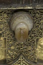 | Keywords: MCC-68515 Evangelistarium (Bernulphuscodex) (6).jpg Artwork nl Anonymous Zuid-Duitsland Reichenau OSB nl De kern van de boekband van de Bernulphuscodex wordt gevormd door twee eikenhouten platten De rug en het achterplat zijn overtrokken met zeemleer Het voorplat bestaat uit een enigszins verdiept rechthoekig middenveld omgeven door een brede rand In het middenveld bevindt zich een verguld zilveren filigraankruis met een verhoogd ingezwenkt achtkantig middenstuk en breed uitlopende armen Het filigraanwerk bestaat uit cirkelvormige uitwaaierende ranken met bolletjes aan de uiteinden en in het midden hier en daar kleine rozetjes Op het snijpunt van beide kruisarmen bevindt zich een ovale zwartblauw en grijs gekleurde onyx in de bovenarm een klassiek gesneden vrouwenkop van chalcedoon op de rechterarm een stuk donkerrood glas en beneden een bruin gestreepte agaat De bekleding van de linker kruisarm ontbreekt De lager gelegen velden tussen de kruisarmen zijn bekleed met dunne gouden platen Langs de randen hiervan is een parelrandje gestanst In het midden van de velden bevindt zich een medaillon met email-cloisonné De bovenste twee zijn voorzien van een diagonaal patroon met witte getrapte vierkantjes met rode stip tegen een donkerblauwe achtergrond Op de onderste twee is een stervormig respectievelijk concentrisch patroon aangebracht De aldaar toegepaste kleuren zijn translucide groen opaak wit geel en bruinpaars In de buitenste hoeken van de lager gelegen velden zijn ronde stenen in een vierkante zetting aangebracht Hiervan is slechts de opaal in de rechter bovenhoek bewaard gebleven In de overige hoeken is alleen nog de vierkante uitsparing te zien De brede rand is overtrokken met verguld zilveren stroken met grote rozetten die van elkaar gescheiden zijn door vier kleine stippelroosjes tussen twee evenwijdig lopende parelrandjes Aan de korte zijden van het voorplat ontbreekt de rozettenrand; slechts de spijkers waarmee ze waren vastgemaakt zijn nog te zien Aan de lange zijde ontbreekt een stuk uit de rand en wel links onder het midden Verdeeld over de nog aanwezige rozetten zijn vier alsengemmen en twee zilveren medaillons aangebracht Laatstgenoemde zijn versierd met een gezicht en bladwerk Vier medaillons met de evangelistensymbolen zijn op de hoeken van de brede rand aangebracht van links boven naar rechts onder betreft het de adelaar van Johannes de engel van Mattheus de gevleugelde os van Lucas en de gevleugelde leeuw van Marcus De banderol die de figuren dragen vermeldt de naam van de betreffende evangelist De naam van Marcus staat in spiegelbeeld Het woord Lucas is over andere letters gekrast De armen van het kruis de acht segmenten van het middenstuk alsmede de sierstukken zijn omlijst met een fijn geparelde gouden filigraandraad Techniek nog in te vullen volgens Korteweg zijn de medaillons met symbolen van Marcus en Lucas uit een graveerplaat gezaagd; rozetten in rand gestanst De sierlijst met rozetten is met behulp van kleine spijkertjes op de houten rand bevestigd Staat nog in te vullen Volgens Korteweg 1979 waren de medaillons met de symbolen van Johannes en Mattheus oorspronkelijk geëmailleerd De velden vertonen nog sporen van gekleurd email Volgens Steenbock 1965 waren het juist de medaillons met Lucas en Marcus Volgens Korteweg 1979 is het verguldsel van de stroken met rozetten enigszins afgesleten Onder de linkerzijde van het metaalwerk van het voorplat bevindt zich rode zijde; aan de smalle zijden van het voorplat ontbreken de rozettenranden slechts de spijkers waarmee ze waren vastgemaakt zijn nog te zien Aan de lange zijde links onder het midden ontbreekt een stuk uit de rand Van het chalcedonen vrouwenkopje ontbreekt de neus en is de kin beschadigd between u'1040' u'1200' u'1050' u'1499' nl perkament eikenhout zilver goud chalcedoon onyx glas agaat opaal Size 31 5 24 0 cm nl Hoogte 31 5cm Breedte 24 0cm Diepte 9 8cm Institution Museum Catharijneconvent object history exhibition history credit line nl Foto Museum Catharijneconvent Utrecht foto HetFotoAtelier Peter Rothengatter Reproduction title nl Boekband voorzijde detail accession number Object number 68515 Inventory number ABM h3 place of creation https //www catharijneconvent nl/adlib/68515/ View this work on the website of Museum Catharijneconvent Museum Catharijneconvent Cc-zero <gallery> File MCC-68515_Evangelistarium_Bernulphuscodex_ 353 jpg File MCC-68515_Evangelistarium_Bernulphuscodex_ 412 jpg File MCC-68515_Evangelistarium_Bernulphuscodex_ 160 jpg File MCC-68515_Evangelistarium_Bernulphuscodex_ 6 jpg File MCC-68515_Evangelistarium_Bernulphuscodex_ 393 jpg File MCC-68515_Evangelistarium_Bernulphuscodex_ 89 jpg File MCC-68515_Evangelistarium_Bernulphuscodex_ 270 jpg File MCC-68515_Evangelistarium_Bernulphuscodex_ 425 jpg File MCC-68515_Evangelistarium_Bernulphuscodex_ 104 jpg File MCC-68515_Evangelistarium_Bernulphuscodex_ 291 jpg File MCC-68515_Evangelistarium_Bernulphuscodex_ 398 jpg File MCC-68515_Evangelistarium_Bernulphuscodex_ 339 jpg File MCC-68515_Evangelistarium_Bernulphuscodex_ 65 jpg File MCC-68515_Evangelistarium_Bernulphuscodex_ 403 jpg File MCC-68515_Evangelistarium_Bernulphuscodex_ 311 jpg File MCC-68515_Evangelistarium_Bernulphuscodex_ 159 jpg File MCC-68515_Evangelistarium_Bernulphuscodex_ 347 jpg File MCC-68515_Evangelistarium_Bernulphuscodex_ 453 jpg File MCC-68515_Evangelistarium_Bernulphuscodex_ 289 jpg File MCC-68515_Evangelistarium_Bernulphuscodex_ 273 jpg File MCC-68515_Evangelistarium_Bernulphuscodex_ 286 jpg File MCC-68515_Evangelistarium_Bernulphuscodex_ 236 jpg File MCC-68515_Evangelistarium_Bernulphuscodex_ 447 jpg File MCC-68515_Evangelistarium_Bernulphuscodex_ 227 jpg File MCC-68515_Evangelistarium_Bernulphuscodex_ 110 jpg File MCC-68515_Evangelistarium_Bernulphuscodex_ 139 jpg File MCC-68515_Evangelistarium_Bernulphuscodex_ 276 jpg File MCC-68515_Evangelistarium_Bernulphuscodex_ 10 jpg File MCC-68515_Evangelistarium_Bernulphuscodex_ 325 jpg File MCC-68515_Evangelist