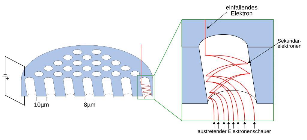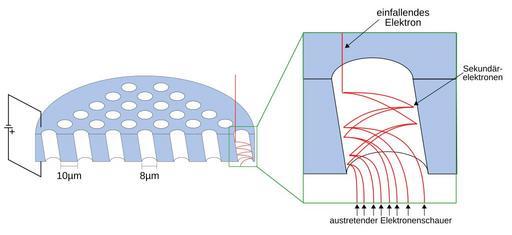 | Keywords: Mcp-de.svg  schematische Darstellung einer Mikrokanalplatte Micro channel plate inklusiver dreifacher Kaskade vereinfacht in Vergrößerung - deutsche Beschriftung micro channel plate with magnification of a triple cascade simplified - german labels Own 01 40 11 January 2008 UTC Andreas 06 free to use without restrictions Microchannel plates |