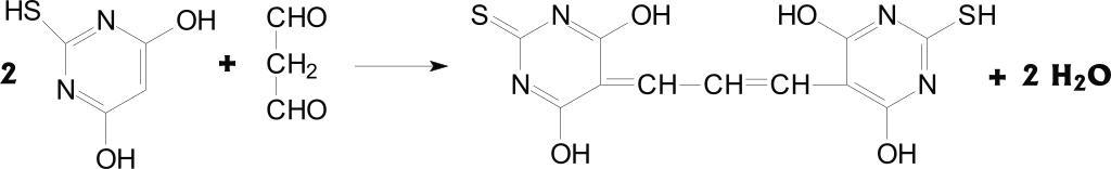 Keywords: MDA TBA reaction 01.svg Die Reaktion von Malondialdehyd MDA mit zwei Molekülen Thiobarbitursäure TBA zu einem Farbstoff The raction of malondialdehde MDA with twi molecules of thiobarbituric acid TBA forming a dye own 2011-06-13 Kuebi Armin Kübelbeck Aldehydes |