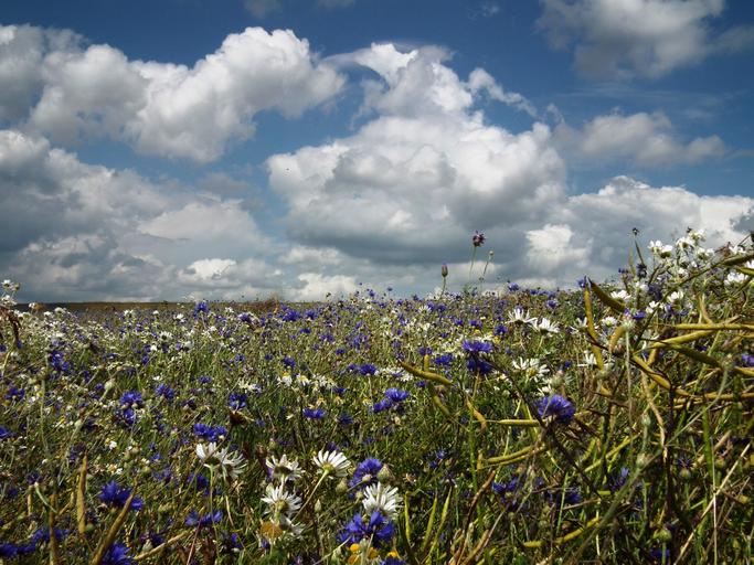 Keywords: meadow fields summer flower meadow blue white sky landscape clouds flowers cornflower chamomile oilseed rape
