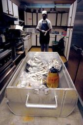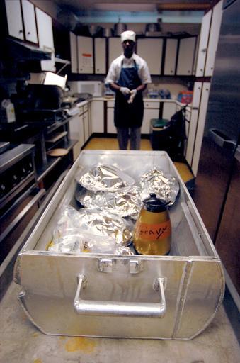| Keywords: Meals are issued to the compression lad crew using a special airlock..jpg  en 030216-N-6967M-015 CS2 Antonio Spain has been temporarily assigned to work in the Ocean Simulation Facility galley for the full two-week dive Meals are prepared loaded in a circular container placed in an air lock and sent to depth for the divers All Hands June 2004 pg 27 Photo by Photographer's Mate 1st Class AW Shane T McCoy RELEASED http //www navy mil/view_ahhphotos asp page 13 Shane T McCoy 2004-06 PD-USGov-Military-Navy Photographs by Shane T McCoy Meals of the United States Navy Surface equipment for underwater diving United States Navy Experimental Diving Unit |
