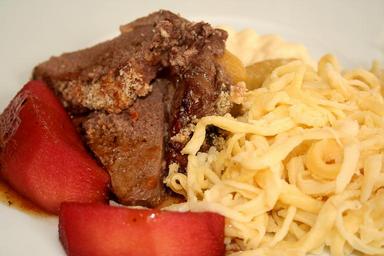 Keywords: meat eat menu meal lunch delicious main course fillet loin spätzle pasta