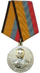 | Keywords: Medal of General Khrulev MoD RF.jpg en Russian Federation Defense Ministry Medal of Army General Khrulev Instituted on 10 July 2004 by ministerial order 210 Awarded to senior logistics officers of the Armed Forces of the Russian Federation to officials responsible for ship management and that served for or have served in the armed forces for 20 years or more as well as veterans of military service for great personal contribution to the organization of logistical troops fr Fédération Russe médaille du Ministère de la Défense Médaille du general d'armée Khrulev Instituée le 10 Juillet 2004 sur ordre ministérielle numéro 210 Attribué à des officiers supérieurs de la logistique train des Forces armées de la Fédération Russe aux fonctionnaires chargés de la gestion qui servent ou qui ont servi dans les forces armées pendant 20 ans ou plus ainsi qu aux anciens combattants du service logistique militaire pour la grandes contributions personnelles à l'organisation des troupes du train ru едаль инисте ства обо оны РФ Гене ал а мии Х улев Уч еждена п иказом инисте ства обо оны РФ 210 от 10 07 2004 г едалью наг аждаются высшие и ста шие офице ы Воо уженных Сил Российской Феде ации наг ажденные знаком отличия офице ов Тыла Воо уженных Сил Российской Феде ации г ажданский пе сонал Воо уженных Сил Российской Феде ации вете аны п о аботавшие и или п ослужившие в Воо уженных Силах 20 лет и более в календа ном исчислении а также д угие должностные лица ведающие в соответствии с действующим законодательством войсковым ко абельным хозяйством за большой личный вклад в о ганизацию тылового обеспечения войск сил own Fdutil Medals of the Russian Federation Medals of Russian Ministry of Defence Medals of Russia PD-RU-exempt orders decorations and medals |