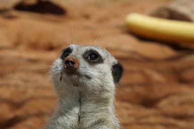 Keywords: meerkat head portrait face close attention cute awakened furry expression guards security guard guard pose keep an eye out animal portrait