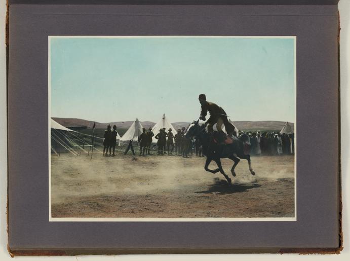 | Keywords: Meetings of British, Arab, and Bedouin officials in Amman, Jordan, April 1921 - File 24.tif en Photographs show meetings between Arab Bedouin and British officials around April 17-27 1921 at Amir Abdullah ibn Hussein's camp at Amman Jordan During these meetings British High Commissioner Herbert Samuel proclaimed Amir Abdullah as the ruler of Transjordan under British protection Among the persons depicted are Amir Abdullah John D Whiting possibly Sheik Sultan of the Belka Sultan ibn 'Ali id Diab ul 'Adwan Amir Shaker bin Zeid future Regent of Transjordan Bedouin chief Auda Abu Tayi Sheik Majid Pasha el Adwan Herbert Samuel British civil administrator Wyndham Deedes British diplomat Albert Abramson T E Lawrence Lawrence of Arabia and possibly Iraq civil administrator Gertrude Bell Also shown are horse racing an airplane landing at Abdullah's camp Circassian leaders Abudullah's bodyguard on camels and Herbert Samuel reading his proclamation of Abdullah as leader of Transjordan Reproduction Number LC-DIG-ppmsca-15304 digital files of original photos LC-DIG-ppmsca-15305 digital files of album pages Rights Advisory No known restrictions on publication Access Advisory For reference access please use the digital images in the online catalog to preserve the fragile original items Notes Photographs were created by the photographers of the American Colony Photo Department located in Jerusalem Founded in the late 1890s by Elijah Meyers the photo agency was headed during its heyday ca 1903-1933 by Lewis Larsson whose staff photographers included Erik Lind Lars Lind Furman Baldwin and G Eric Matson It transitioned into the Matson Photo Service around 1940 with photography by Matson Hanna Safieh Joseph H Giries and others John D Whiting contributed periodically to the work of both agencies The images in this album were probably taken by Lewis Larsson and/or Eric Matson For more information see http //hdl loc gov/loc pnp/pp matpc and http //www loc gov/rr/print/coll/629_whiting html Some caption information for these photographs based on information from matching negatives in the G Eric and Edith Matson Photograph Collection LC-M32-1942 LC-M32-1952 LC-M32-1951 LC-M32-1954 LC-M32-1956 M32-1957 and LC-M32-50280-x Album unpaginated album page numbers supplied by Library staff Pages 1-2 and verso of each page are blank One unattached photograph was found with the album and is stored with it Photograph is a portrait of a Jordanian man in traditional dress Blind stamp Hagop Berberian Amman Stamped on verso Copyright reserved By appointment to H M the King photographers Hagop Berberian Son More information about the events and people depicted in the album are available in the John D Whiting Supplementary Archive Box 1 LOT title devised by Library staff John D Whiting's diaries correspondence and other materials are located in the Library of Congress Manuscript Division Papers of John D Whiting Forms part of Visual materials from the papers of John D Whiting Library of Congress Transfer; Manuscript Division; 2006; DLC/PP-2006 051 29 Subjects Samuel Herbert Louis Samuel --Viscount --1870-1963 Lawrence T E -- Thomas Edward --1888-1935 Abdullah --King of Jordan --1882-1951 Deedes Wyndham Henry --Sir --1883-1956 Shākir ibn Zayd --Prince son of Zayd ibn Fawwāz Amir of Ṭāʾif --1885-1934 Bell Gertrude Lowthian --1868-1926 Jordan--History--1919-1946 American Colony Jerusalem --People--1920-1930 British--Jordan--Amman--1920-1930 Arabs--Jordan--Amman--1920-1930 Bedouins--Jordan--Amman--1920-1930 Circassians--Jordan--Amman--1920-1930 Tribal chiefs--Jordan--Amman--1920-1930 Meetings--Jordan--Amman--1920-1930 Camps--Jordan--Amman--1920-1930 Government officials--Jordan--Amman--1920-1930 Biplanes--Jordan--Amman--1920-1930 Proclamations--Jordan--Amman--1920-1930 April 17-27 1921 http //www loc gov/pictures/item/mpc2010001545/PP/resource/ Whiting John D John David 1882-1951 photographer Larsson Lewis photographer Matson G Eric Gästgifvar Eric 1888-1977 photographer other versions Wikimedia Levant - GLAM PD-Jordan 1921 Herbert Samuel and Amir Abdullah meetings |