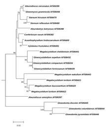 | Keywords: Megalocystidium-Mamximum-Likelihood-Tree.svg Megalocystidium Figure Molecular Phylogenetic analysis of Megalocystidium by the Maximum Likelihood method<br/> The evolutionary history was inferred by using the Maximum Likelihood method based on the Kimura 2-parameter model 1 The tree with the highest log likelihood -4055 6447 is shown The percentage of trees in which the associated taxa clustered together is shown next to the branches A user-specified tree was used as an initial tree in the heuristic search A discrete Gamma distribution was used to model evolutionary rate differences among sites 5 categories +G parameter 1 0022 The rate variation model allowed for some sites to be evolutionarily invariable +I 71 5627 sites The tree is drawn to scale with branch lengths measured in the number of substitutions per site The analysis involved 20 nucleotide sequences All positions with less than 95 site coverage were eliminated That is fewer than 5 alignment gaps missing data and ambiguous bases were allowed at any position There were a total of 1158 positions in the final dataset Evolutionary analyses were conducted in http //megasoftware net/ MEGA6 2<br/> 1 Kimura M 1980 A simple method for estimating evolutionary rate of base substitutions through comparative studies of nucleotide sequences Journal of Molecular Evolution 16 111-120 <br/> 2 Tamura K Stecher G Peterson D Filipski A and Kumar S 2013 MEGA6 Molecular Evolutionary Genetics Analysis version 6 0 Molecular Biology and Evolution30 2725-2729 <br/> http //www ncbi nlm nih gov/nuccore/AF506400 Acanthophysellum lividocoeruleum AF506400 http //www ncbi nlm nih gov/nuccore/AF506398 Aleurobotrys botryosus AF506398 http //www ncbi nlm nih gov/nuccore/AF506399 Aleurodiscus cerussatus AF506399 http //www ncbi nlm nih gov/nuccore/AF506382 Conferticium ravum AF506382 http //www ncbi nlm nih gov/nuccore/AF506432 Gloeocystidiellum aspellum AF506432 http //www ncbi nlm nih gov/nuccore/AF506434 Gloeocystidiellum compactum AF506434 http //www ncbi nlm nih gov/nuccore/AF506439 Gloeocystidiellum formosanum AF506439 http //www ncbi nlm nih gov/nuccore/AF506444 Gloeodontia columbiensis AF506444 http //www ncbi nlm nih gov/nuccore/AF506445 Gloeodontia discolor AF506445 http //www ncbi nlm nih gov/nuccore/AF506446 Gloeodontia pyramidata AF506446 http //www ncbi nlm nih gov/nuccore/AF506448 Gloeomyces graminicola AF506448 http //www ncbi nlm nih gov/nuccore/AF506441 Megalocystidium chelidonium AF506441 http //www ncbi nlm nih gov/nuccore/AF506420 Megalocystidium leucoxanthum AF506420 http //www ncbi nlm nih gov/nuccore/AF506421 Megalocystidium luridum AF506421 http //www ncbi nlm nih gov/nuccore/AF506422 Megalocystidium luridum AF506422 http //www ncbi nlm nih gov/nuccore/AF506443 Megalocystidium wakullum AF506443 http //www ncbi nlm nih gov/nuccore/AF506479 Stereum hirsutum AF506479 http //www ncbi nlm nih gov/nuccore/AF506480 Stereum reflexulum AF506480 http //www ncbi nlm nih gov/nuccore/AF506491 Xylobolus frustulatus AF506491 http //www ncbi nlm nih gov/nuccore/AF506397 Aleurodiscus amorphus AF506397 own 2014-09-09 Thkgk Cc-zero other versions Megalocystidium |