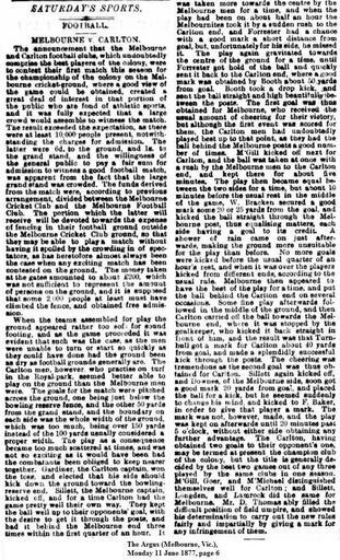 Keywords: Melbourne v Carlton 1877.jpg First match of 1877 between Melbourne Carlton from the http //www nla gov au/ndp/ National Library Australian newspapers digitisation program which are pre-1955 so no copyright The service includes newspapers published in each state and territory from the 1800s to the mid-1950s when copyright applies http //www nla gov au/ndp/ National Library Australian newspapers digitisation program 1877-06-11 The Argus Melbourne Vic PD-Australia History of Australian rules football Melbourne Football Club Carlton Football Club Newspapers of Australia National Library of Australia - Australian Newspapers Service
