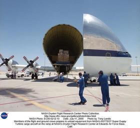 Keywords: Members of the flight and ground crews prepare to unload equipment from NASA's B377SGT Super Guppy T DVIDS727520.jpg en Members of the flight and ground crews prepare to unload equipment from NASA's B377SGT Super Guppy Turbine cargo aircraft on the ramp at NASA's Dryden Flight Research Center at Edwards Air Force Base Calif The outsize cargo plane had delivered the latest version of the X-38 flight test vehicle to NASA Dryden when this photo was taken on June 11 2000 The B-377SGT Super Guppy Turbine evolved from the 1960s-vintage Pregnant Guppy Mini Guppy and Super Guppy used for transporting sections of the Saturn rocket used for the Apollo program moon launches and other outsized cargo The various Guppies were modified from 1940's and 50's-vintage Boeing Model 377 and C-97 Stratocruiser airframes by Aero Spacelines Inc which operated the aircraft for NASA NASA's Flight Research Center assisted in certification testing of the first Pregnant Guppy in 1962 One of the turboprop-powered Super Guppies built up from a YC-97J airframe last appeared at Dryden in May 1976 when it was used to transport the HL-10 and X-24B lifting bodies from Dryden to the Air Force Museum at Wright-Patterson Air Force Base Ohio NASA's present Super Guppy Turbine the fourth and last example of the final version first flew in its outsized form in 1980 It and its three sister ships were built in the 1970s for Europe's Airbus Industrie to ferry outsized structures for Airbus jetliners to the final assembly plant in Toulouse France It later was acquired by the European Space Agency and then acquired by NASA in late 1997 for transport of large structures for the International Space Station to the launch site It replaced the earlier-model Super Guppy which has been retired and is used for spare parts NASA's Super Guppy Turbine carries NASA registration number N941NA and is based at Ellington Field near the Johnson Space Center For more information on NASA's Super Guppy Turbine log onto the Johnson Space Center Super Guppy web page at http //spaceflight nasa gov/station/assembly/superguppy/ NASA Identifier NIX-EC00-0212-13 2009-09-23 Glenn Research Center https //www dvidshub net/image/727520 727520 2012-10-17 14 04 WASHINGTON DC US PD-USGov Aircraft at Edwards Air Force Base Wright-Patterson Air Force Base Images from DoD uploaded by Fæ |