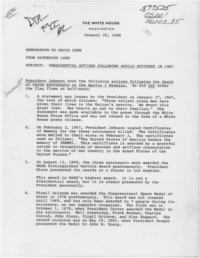 | Keywords: Memo from Katherine Ladd to David Chew, re Presidential Actions Following Apollo Accident in 1967 - NARA - 198434.tif Scope and content Memo describing how the astronauts of Apollo I who were killed in a launching pad fire were honored by the Federal Government General notes Memo was researched and drafted in the wake of the January 1986 explosion of the space shuttle Challenger 198434 Local identifier President 1981-1989 Reagan White House Office of Records Management 01/20/1981 - 01/20/1989 Ronald Reagan Library NLRR 40 Presidential Drive Simi Valley CA 93065-0600 1986-01-28 Record group Collection RR-WHORM White House Office of Records Management File Systems White House Central Files 01/20/1981 - 01/20/1989 Record group ARC 1191 White House Office of Records Management WHORM Subject File compiled 01/20/1981 - 01/20/1989 Series ARC 198419 File unit White House Office of Records Managment WHORM Subject File case file OS001 377525 01/27/1967 - 01/28/1986 File unit ARC 198433 Variant control numbers NAIL Control Number NLS-WHORM-SF-OSOS001377525-377525 yes Other versions NARA-cooperation PD-USGov Space Shuttle Challenger disaster |