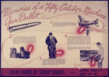 Keywords: Memories of a Fifty Caliber Machine Gun Bullet - NARA - 533982.tif Scope and content General notes 533982 Local identifier 179-WP-125 Office for Emergency Management War Production Board 01/1942 - 11/03/1945 Still Picture Records Section Special Media Archives Services Division NWCS-S National Archives at College Park 8601 Adelphi Road College Park MD 20740-6001 other date circa 1942 1943 Record group Record Group 179 Records of the War Production Board 1918 - 1947 Record group ARC 508 War Production Board compiled 1942 - 1943 Series ARC 533858 File unit File unit ARC Variant control numbers NAIL Control Number NWDNS-179-WP-125 yes Other versions <gallery> File Memories_of_a_Fifty_Caliber_Machine_Gun_Bullet_-_NARA_-_533982 tif tif File Memories_of_a_Fifty_Caliber_Machine_Gun_Bullet_-_NARA_-_533982 jpg jpg </gallery> NARA-cooperation PD-USGov World War II posters from the United States Metal recycling in the United States Recycling in the United States in World War II NARA TIF images with categorized JPGs