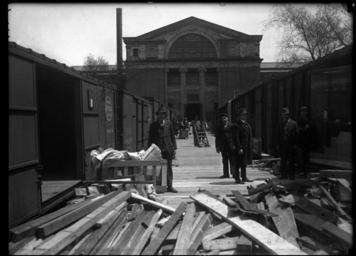 | Keywords: the field museum columbian move blackandwhite monochrome black and white Five men on wooden loading dock with exhibit case, two rows of railroad cars ready for transport in preparation for move to new building. Either west or east side of building, smoke stack visible at left. Museum move series. Outside of the Field Columbian Museum. 1920. Original size and material: 5x7 inch glass negative Digital Identifier: CSGN40499 Part of the Illinois Urban Landscapes Project: www.fieldmuseum.org/urbanlandscapes/ Five men on wooden loading dock with exhibit case, two rows of railroad cars ready for transport in preparation for move to new building. Either west or east side of building, smoke stack visible at left. Museum move series. Outside of the Field Columbian Museum. 1920. Original size and material: 5x7 inch glass negative Digital Identifier: CSGN40499 Part of the Illinois Urban Landscapes Project: www.fieldmuseum.org/urbanlandscapes/ |