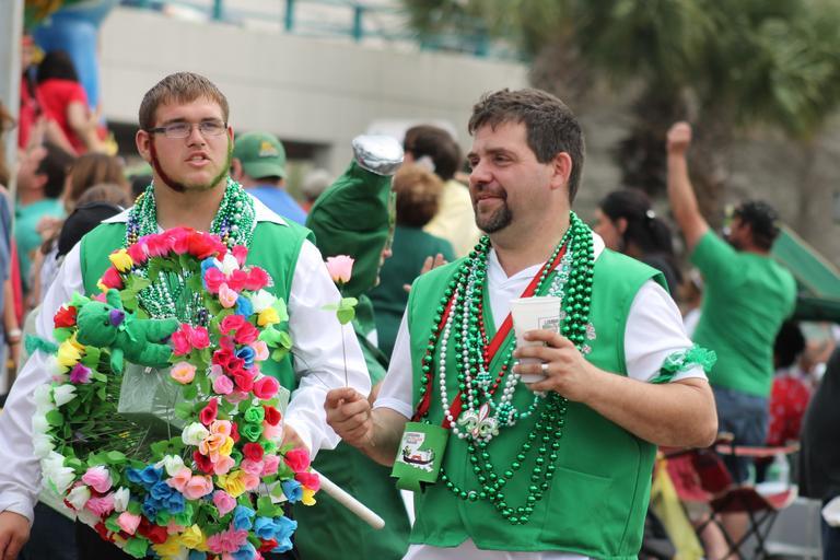 Keywords: men parade outside colorful festival celebration irish parade louisiana