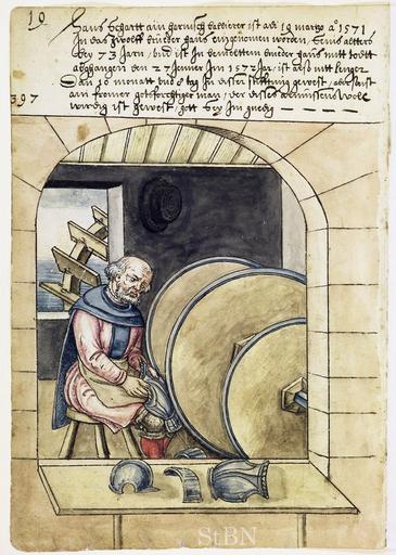 | Keywords: Mendel II 027 v.jpg Hans Schartt Schart; Schardt harnisch ballierer Harnischpolierer Transkription und weitere Informationen siehe http //www nuernberger-hausbuecher de/75-Amb-2-317b-27-v/data Hausbuch der Mendelschen Zwölfbrüderstiftung Band 2 Nürnberg 1550 “1791 Stadtbibliothek Nürnberg Amb 317b 2° via http //www nuernberger-hausbuecher de/ 1572 anonymous PD-old-100 Hausbuch der Mendelschen Zwölfbrüderstiftung Band 2 Armorers in art Grinding in art Grinding mills | ||||