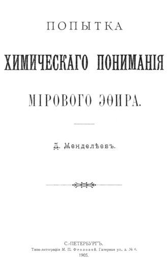 Keywords: Mendeleev Ether Cover 1905.png ru Обложка книги Химическое понимание ми ового эфи а 1905 http //ether-wind narod ru/Mendeleev_1905/ енделеев Д И File Mendeleev An attempt towards a chemical Conception of the Ether 1904 jpg PD-Art Uploaded with UploadWizard Literary works by Dmitri Mendeleev