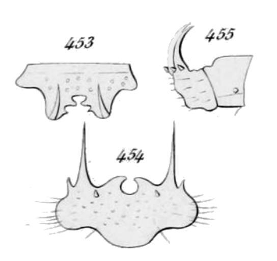 | Keywords: Menephilus cylindricus larva detail2.png en abdominal appendices of larva of Menephilus cylindricus from different views<br>Fig 453 upside; Fig 454 from behind Fig 455 from side<br> after Éduard Perris Histoire des insectes du pin maritime Paris 1863 from plate 8 1857 Fig 444 - Fig 457 Éduard Perris Histoire des insectes du pin maritime Perris Plate 8 1857 1857 Menephilus cylindricus PD-old | ||||