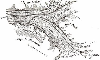 Keywords: Mer de Glace sketchmap by John Tyndall, 1857, from 1896 edition.png Mer de Glace sketchmap by John Tyndall 1857 Fig 7<ref>Tyndall page 53 Fig 7 </ref> shows Aiguille Noire to the south bottom-right dividing the Cascade at the west bottom from Glacier des Périades right which flows north to join Glacier du Géant flowing south to north 14 degrees clockwise between Mont Tacul on the east centre right and Aiguilles de Charmoz to the west bottom alongside morraine 'b' This forms the medial morraine 'a' Some 3 kilometres downstream Glacier de Lechaud joins du Géant forming medial morraine 'c' Just prior to this confluence Cascade du Talèfre with its own medial morraine 'e' joins Lechaud forming morraine 'd' Here the glacier is known as the Mer De Glace and flows north-north-west leftwards between Aiguille du Moine on the east and Trélaporte on the west Notes 2 References cite book The Glaciers of the Alps John Tyndall 1896 Longmans Green and Co http //www archive org/details/glaciersalpsbeing00tyndrich 2008-02-29 PDF from http //www archive org/details/glaciersalpsbeing00tyndrich or alternative http //books google it/books id 8_cN1DQ3mZ4C printsec frontcover hl en PPA53 M1 1896 John Tyndall 1820-1893 PD-old Maps of glaciers Mer de Glace Glacier de Leschaux Glacier du Tacul Glacier de Trélaporte Glacier des Périades Glacier de Talèfre John Tyndall 1896 maps Maps of Haute-Savoie Engraved maps Maps of confluences of glaciers |