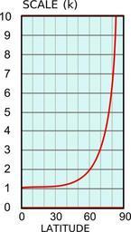 Keywords: Mercator scale plot.svg en The scale factor as a function of latitude in the Mercator projection own Peter Mercator 2010-08-06 Mercator projections Geometry diagrams Geographic diagrams