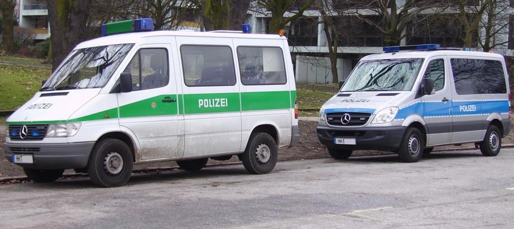 Keywords: Mercedes-Benz Sprinter Polizei Hamburg.jpg en Two Mercedes-Benz Sprinter police cars of the police of Hamburg To the left an older 312 in green to right a newer one in blue de Zwei Mercedes-Benz Sprinter Polizeiwagen der Hamburger Polizei Links ein älterer 312 D in alter grün-weißer Lackierung rechts ein neueres Modell in silber-blauer Lackierung own Garitzko 2009-03 Police automobiles in Germany Blue and silver police automobiles Mercedes-Benz Sprinter 1995 in police service Mercedes-Benz Sprinter 2006 in police service
