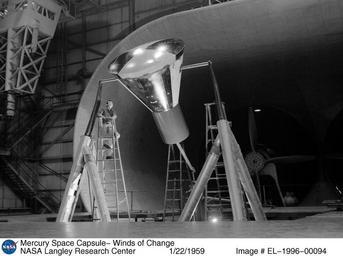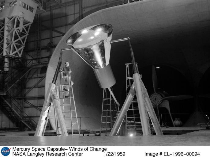 | Keywords: Mercury Space Capsule- Winds of Change DVIDS701502.jpg en A Langley technician checks the Mercury full-scale capsule model prior to testing in the 30- by 60-Foot Tunnel in 1959 at NASA Langley Research Center Much of the research and development of the Mercury program was conducted at Langley Originally built in the early 1930s to test full-scale aircraft the 30 by 60 tested many of the bombers and fighter planes used in World War II Although it was retired in October 1995 the 30 by 60 is one of NASAs largest wind tunnels and is a National Historic Landmark Many of the tests on the late 1980s and early 1990s were free-flight tests of dynamically scaled models in the test section This technique allowed researchers to measure and assess flight characteristics as well as evaluate control options NASA Identifier L59-336 2009-09-24 Glenn Research Center https //www dvidshub net/image/701502 701502 2012-10-10 14 54 WASHINGTON DC US PD-USGov Langley Research Center Images from DoD uploaded by Fæ |