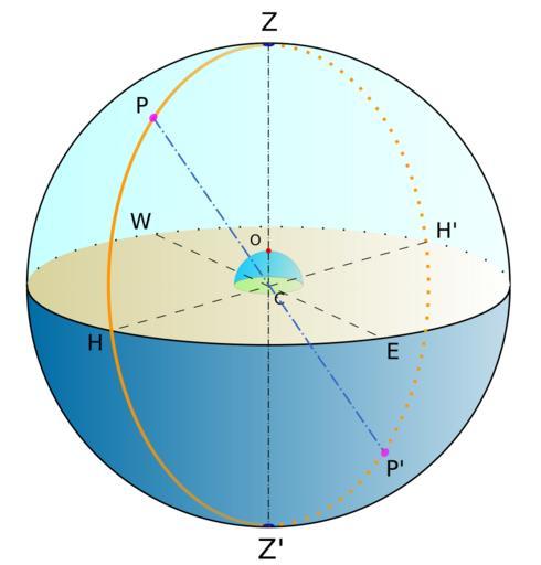 | Keywords: Meridiano.svg Sfera celeste sono evidenziati i poli celesti e in arancione il meridiano P è il polo celeste elevato P' il polo celeste depresso Z lo Zenith Z' il Nadir C il centro della Terra e della sfera celeste O l'osservatore sulla superficie terrestre il cerchio PZP'Z' il meridiano Celestial sphere with poles and meridian C is the center of the celestial sphere O is the observer Own 2006-12-08 CAV Cc-zero Cc-pd Kopimi Astronomy sketches Celestial coordinate systems Celestial spheres |