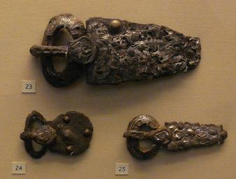 Keywords: Merovingian belt buckles.jpg en Merovingian belt buckles 7th century AD British Museum London 23 with style II animal interlace 24 pattern which imitates garnet inlay 25 with style II animal interlace de Merowingische Gürtelgarnituren 7 Jahrhundert n Chr British Museum London 23 Germanischer Tierstil II 24 Muster das Granat-Tauschierung imitiert 25 Germanischer Tierstil II own Völkerwanderer 2011 Cc-zero Ancient Germanic belt buckles in England Ancient Germanic belt buckles in France Room 41 British Museum 7th-century metalwork Merovingian belt buckles Animal style |