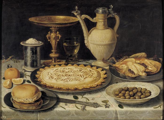 | Keywords: Mesa (Clara Peeters).jpg Artwork Creator Clara Peeters es Mesa one of a set of four in the Prado the other 3 dated 1611 probably 1611 Oil on panel size cm 55 73 Institution Prado accession number P01622 object history credit line http //www museodelprado es/imagen/alta_resolucion/P01622 jpg PD-old Clara Peeters Flemish paintings in the Museo del Prado 17th-century oil on panel paintings in Spain Still life paintings of food Oil still life paintings 17th-century still life paintings in Spain 1610s still life paintings Still life paintings of tableware Paintings by Clara Peeters in the Museo del Prado Rosette-shaped pastries Olives in art Rummers in paintings Poultry-based food Paintings of poultry Bread rolls Breads in art Paintings of oranges Pitchers Silver cutlery Eating knives Pitchers in art Table with food |