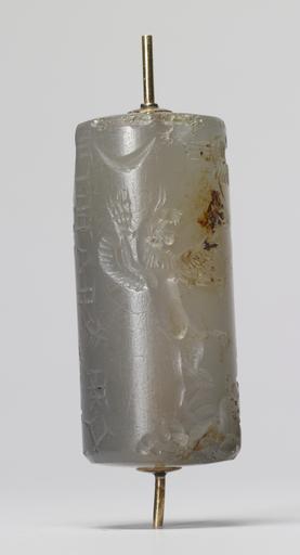 | Keywords: Mesopotamian - Cylinder Seal with Archer and Winged Lion - Walters 421195 - Side B.jpg A worshiper faces a deity standing on a griffin and aiming his bow and arrow at an upright winged lion-demon The winged disk of Ashur the patron god of Assyria appears above The three-line inscription gives the name of the owner Assyrians enjoyed the translucent and vibrant colors of semiprecious stones such as chalcedony between 900 700 BC Neo-Assyrian carved chalcedony gold cm 6 6 2 1 h x diam accession number 42 1195 34654 Mrs Henry Walters New York Sale Joseph Brummer New York 1941 Walters Art Museum 1942 by purchase Museum purchase 1942 Inscription place of origin Mesopotamia Walters Art Museum license Cylinder seals in the Walters Art Museum Art of Mesopotamia in the Walters Art Museum Media contributed by the Walters Art Museum needs category review |