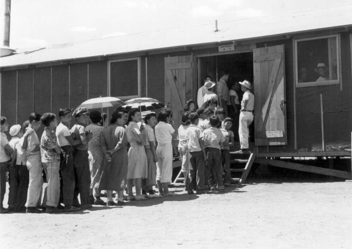 Keywords: Mess Hall Line.jpg en <pre>Title Part of a line waiting for lunch outside the mess hall at noon -- Photographer Lange Dorothea -- Manzanar California 7/1/42 Identifier Volume 21 Identifier Section C Identifier WRA no C-670 Collection War Relocation Authority Photographs of Japanese-American Evacuation and Resettlement Series 8 Manzanar Relocation Center Manzanar CA Contributing Institution The Bancroft Library University of California Berkeley http //content cdlib org/ark /13030/ft7h4nb3tg/ docId ft7h4nb3tg brand jarda layout printable-details Line waiting for lunch</pre> Creator Dorothea Lange PD-USGov original upload log page en wikipedia Mess_Hall_Line jpg 2007-04-18 22 25 Gmatsuda 1400×996× 143129 bytes <nowiki>Title Part of a line waiting for lunch outside the mess hall at noon -- Photographer Lange Dorothea -- Manzanar California 7/1/42 Identifier Volume 21 Identifier Section C Identifier WRA no C-670 Collection War Relocation Authority Photographs </nowiki> Manzanar War Relocation Center Mess halls |