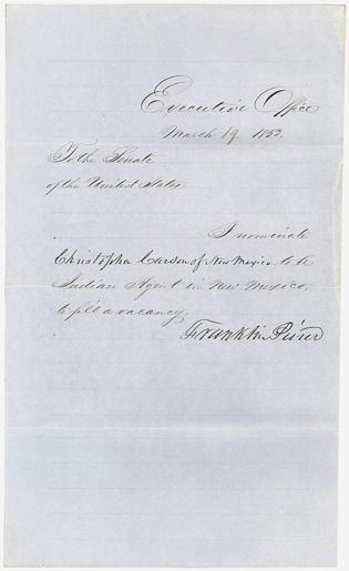 | Keywords: center for legislative archives centerforlegislativearchives u.s. national archives usnationalarchives nara:arcid=306434 president pierce presidentpierce franklin pierce franklinpierce kit carson kitcarson carson indian agent indianagent new mexico newmexico 1853 text writing document drawing sketch Original Caption: Message of President Franklin Pierce nominating Kit Carson to be Indian Agent in New Mexico, 03/19/1853 Created By: U.S. Senate.(03/04/1789 - ) From: Record Group/Collection: 46 From: Executive Nominations for the Special Session of the 33rd Congress, 03/04/1853 - 04/11/1853 Production Dates: 03/19/1853 Persistent URL: arcweb.archives.gov/arc/action/ExternalIdSearch?id=306434 Reference Unit: Center for Legislative Archives (NWL), National Archives Building Access Restrictions: Unrestricted Use Restrictions: Unrestricted Original Caption: Message of President Franklin Pierce nominating Kit Carson to be Indian Agent in New Mexico, 03/19/1853 Created By: U.S. Senate.(03/04/1789 - ) From: Record Group/Collection: 46 From: Executive Nominations for the Special Session of the 33rd Congress, 03/04/1853 - 04/11/1853 Production Dates: 03/19/1853 Persistent URL: arcweb.archives.gov/arc/action/ExternalIdSearch?id=306434 Reference Unit: Center for Legislative Archives (NWL), National Archives Building Access Restrictions: Unrestricted Use Restrictions: Unrestricted |