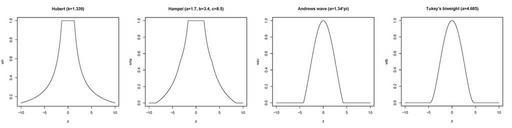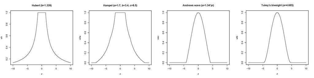 Keywords: Mest weightfunc.jpg en Weight functions for different M estimators The parameter are choosen after the defalt values in SPSS own Sigbert Klinke 2008-11-19 <pre> z <- -1000 1000 /100 Hubert k k <- 1 339 wh <- 1 abs z < k + k sign z /z abs z >k Hampel a <- 1 7 b <- 3 4 c <- 8 5 wha <- 1 abs z < a + a sign z /z abs z >a abs z < b + a c-abs z / c-b sign z /z abs z >b abs z < c Andrews wave a <- 1 34 pi wav <- a/ pi z sin pi z/a abs z < a Tukey's biweight a <- 4 685 wtb <- 1-z 2/a 2 1-z 2/a 2 abs z < a plot z wh type l main Hubert k 1 339 plot z wha type l main Hampel a 1 7 b 3 4 c 8 5 plot z wav type l main Andrews wave a 1 34 pi plot z wtb type l main Tukey's biweight a 4 685 </pre> Created with R Check categories 2009 February 12 de wikipedia M-Schätzer 1 Statistics |