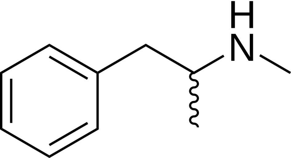 | Keywords: Methamphetamine.svg Note the squiggly line represents a racemic position in the skeletal formula -i e there is a mixture of enantiomers in which the methyl group is oriented toward and away from the viewer en 2D structure of stimulant drug methamphetamine own Harbin 2009-08-25 Methamphetamine f |