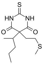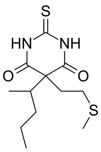 Keywords: Methitural.svg Chemical structure of Methitural Own 16 47 21 May 2012 UTC Ed Edgar181 Barbiturates Thiocarbonyl compounds Thioethers