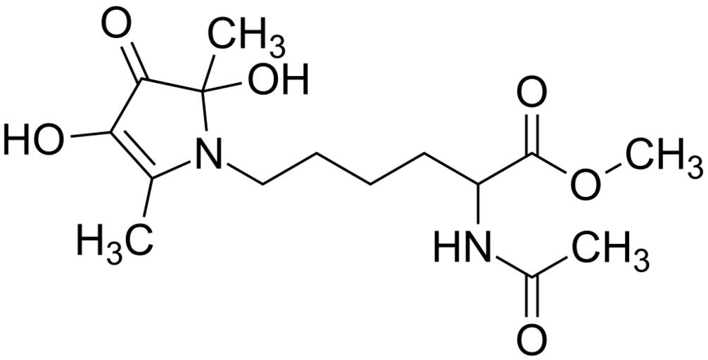 | Keywords: Methyl 2-acetamido-6-(2,4-dihydroxy-2,5-dimethyl-3-oxo-2,3-dihydro-1H-pyrrol-1-yl)hexanoate 200.svg validSVG Structure of methyl 2-acetamido-6- 2 4-dihydroxy-2 5-dimethyl-3-oxo-2 3-dihydro-1H-pyrrol-1-yl hexanoate Own 2014-05-03 Emeldir <span class signature-talk >talk</span> PD-chem Methyl esters Acetamides Azolines Carboxylate esters Enols Cyclic ketones | ||||